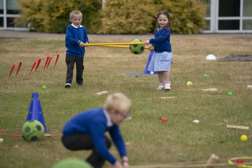 6月8日,在英国斯塔福德郡,兰迪伍德小学学前班的学生们用小棍子做保持安全距离相关游戏。新华社发