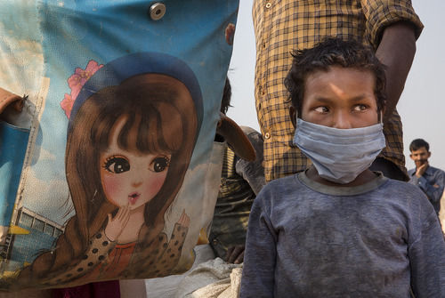 5月18日,在印度新德里郊区的加济阿巴德,一名儿童和家人一起排队等待登上返乡大巴。新华社发