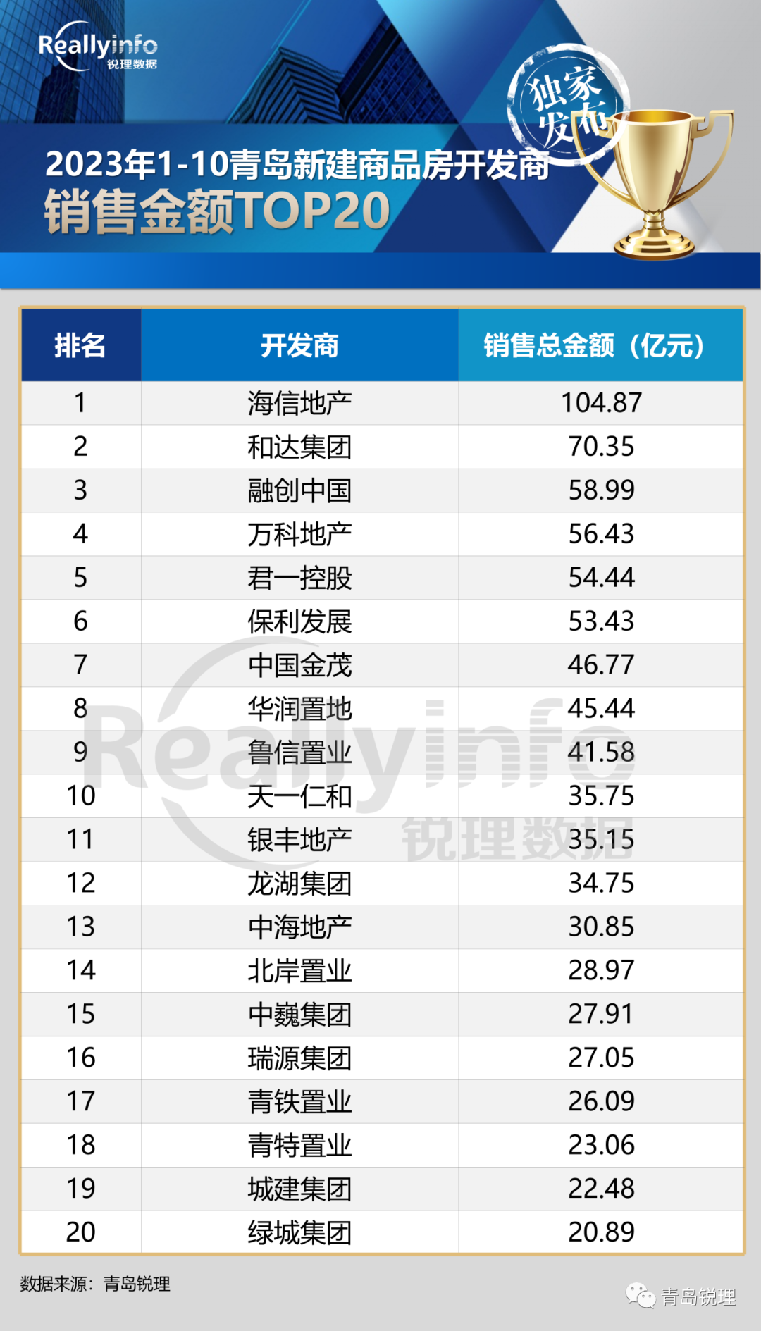 据青岛锐理数据统计,今年1-10月海信地产以销售额第一,夺得青岛楼市房企销售榜单“冠军”称号。此外,本土房企海信、和达、君一控股、鲁信、天一仁和跻身前10强,1-10月新建商品房销售金额TOP20的开发商,合计总销售金额约845亿,占青岛整个市场的49%。