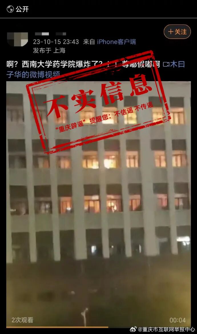 10月16日,重庆市互联网举报中心官方微博对此进行辟谣:经向西南大学校方求证,此为不实信息。学校注意到该情况后,立即通知相关部门对每个楼层进行排查,未发现任何爆炸相关情况。目前,该条微博信息已无法正常打开,谣言线索已转交相关部门进一步核查。