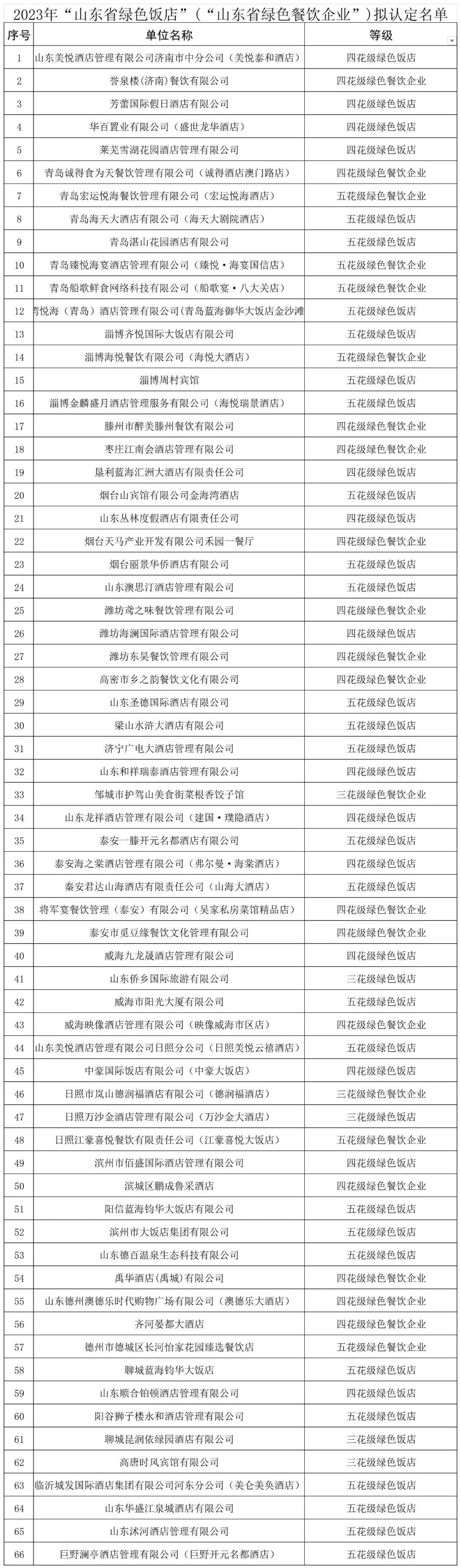 山东省商务厅关于2023年“绿色饭店”评审结果的公示
