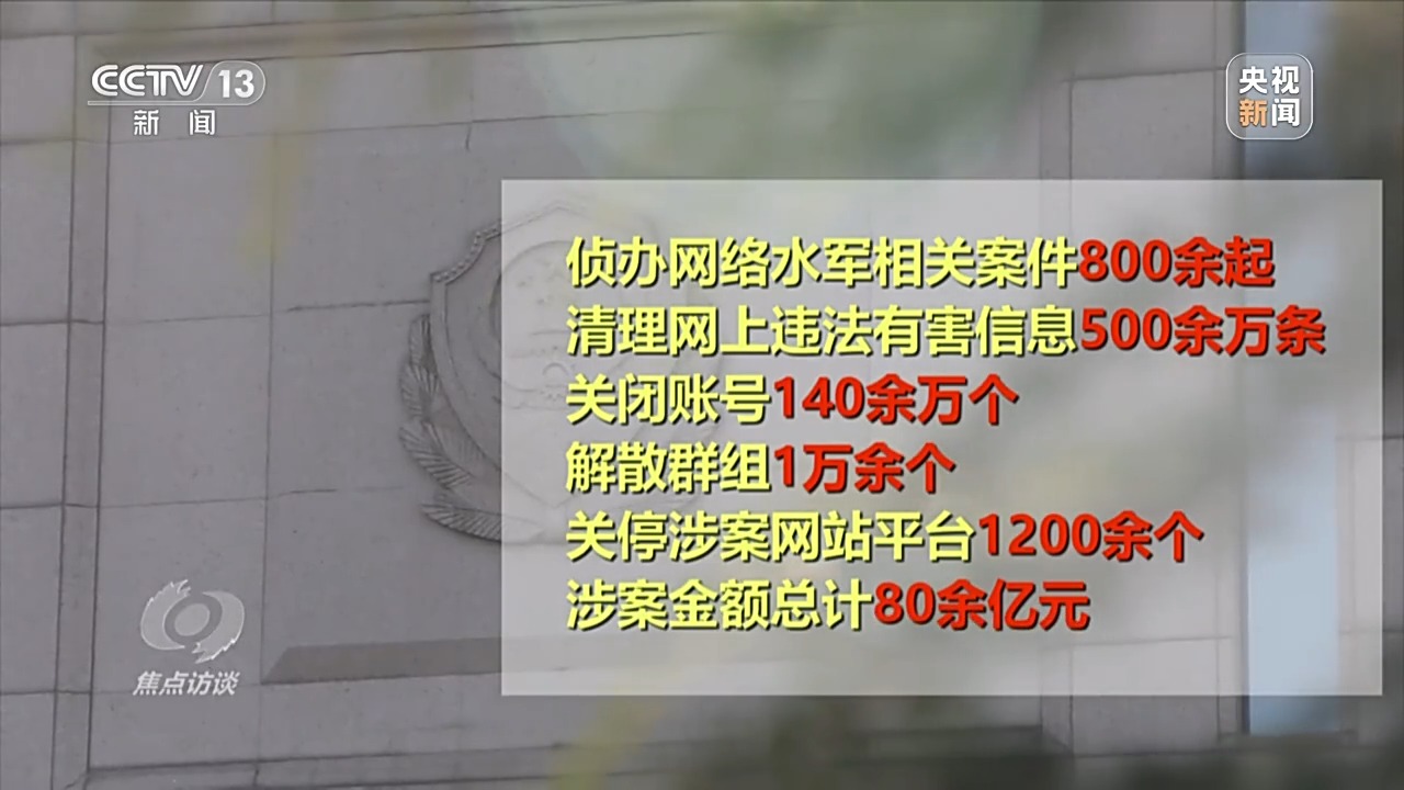 今年以来,公安机关网安部门依托“净网”系列专项行动,已侦办“网络水军”相关案件800余起,清理网上违法有害信息500余万条,关闭账号140余万个,解散群组1万余个,关停涉案网站平台1200余个,涉案金额总计80余亿元。