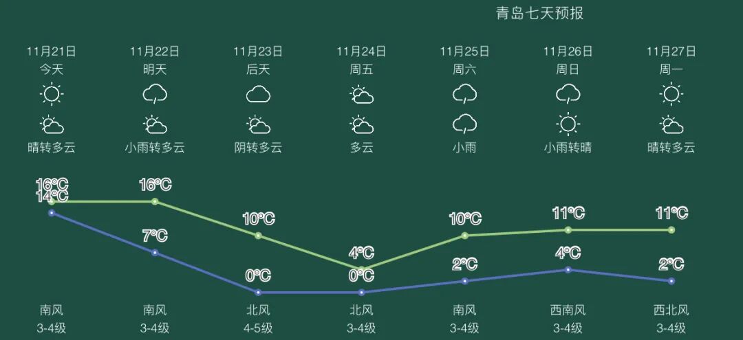 温馨提示:岛城今明两天的天气仍较温暖,有外出计划最好安排在这段时间;23日天气最为复杂,风力大,气温降,北部地区白天有雨夹雪;24日气温最低,天气多云为主,体感寒冷。