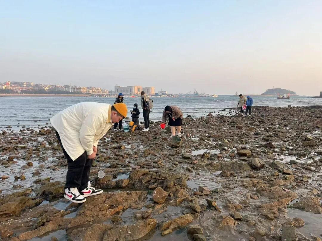 11月21日16时的栈桥景区,远处水天一色,夕阳余晖洒在海面,波涛涌动,闪动粼粼波光,近处长虹卧波,栈桥上人流熙攘,海鸥盘旋,一派旖旎风光。根据潮汐表,当天的最低潮时间将出现于18时左右。此时,潮水逐渐后退,露出了大片礁石和滩涂。赶海的人们散落在岸边,或不停翻动礁石,或挥舞着铲子卖力挖沙,忙得热火朝天。