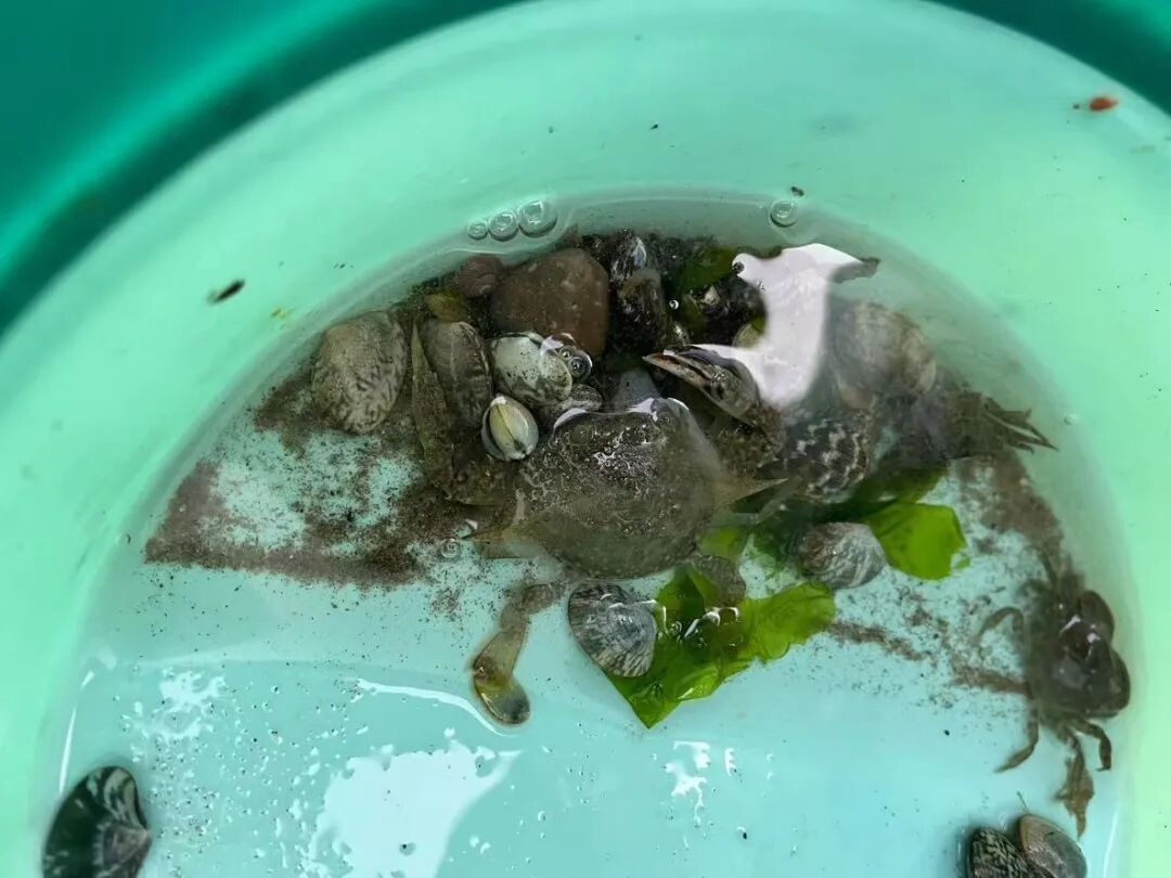 在市民毕女士的水桶中,见到了唯一一只梭子蟹,后盖长度约五六厘米,夹在几只蛤蜊、“屎蟹子”当中,很抓人眼球。“我们就是看了栈桥有梭子蟹的视频之后,今天专门带着孩子来体验体验赶海的。”毕女士说,赶海的乐趣在于收获小海货的满足感,但到了栈桥之后,发现实际情况完全不是视频中呈现的样子,多少有点失望。