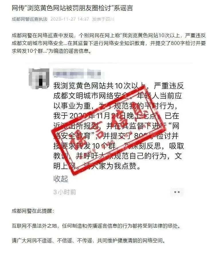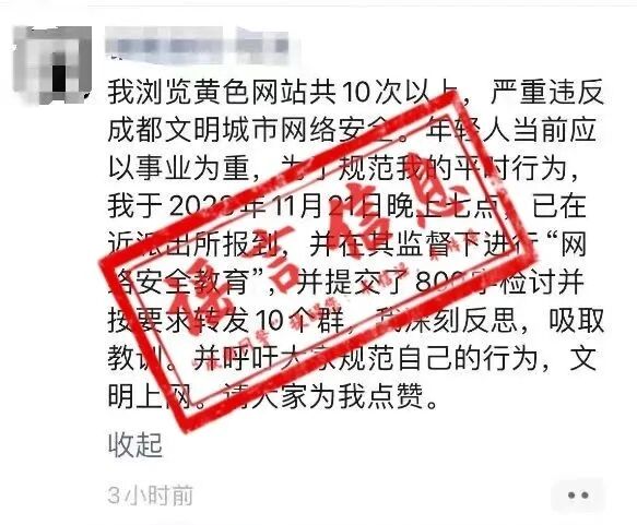 此外,成都也有个别网民在朋友圈公开做检讨,称“浏览黄色网站10次以上,严重违反成都文明城市网络安全,已在相关单位的监督下进行网络安全知识教育,并提交800字检讨,要求转发10个群”,相关截图在微信圈群广泛传播,引发民众围观和讨论。