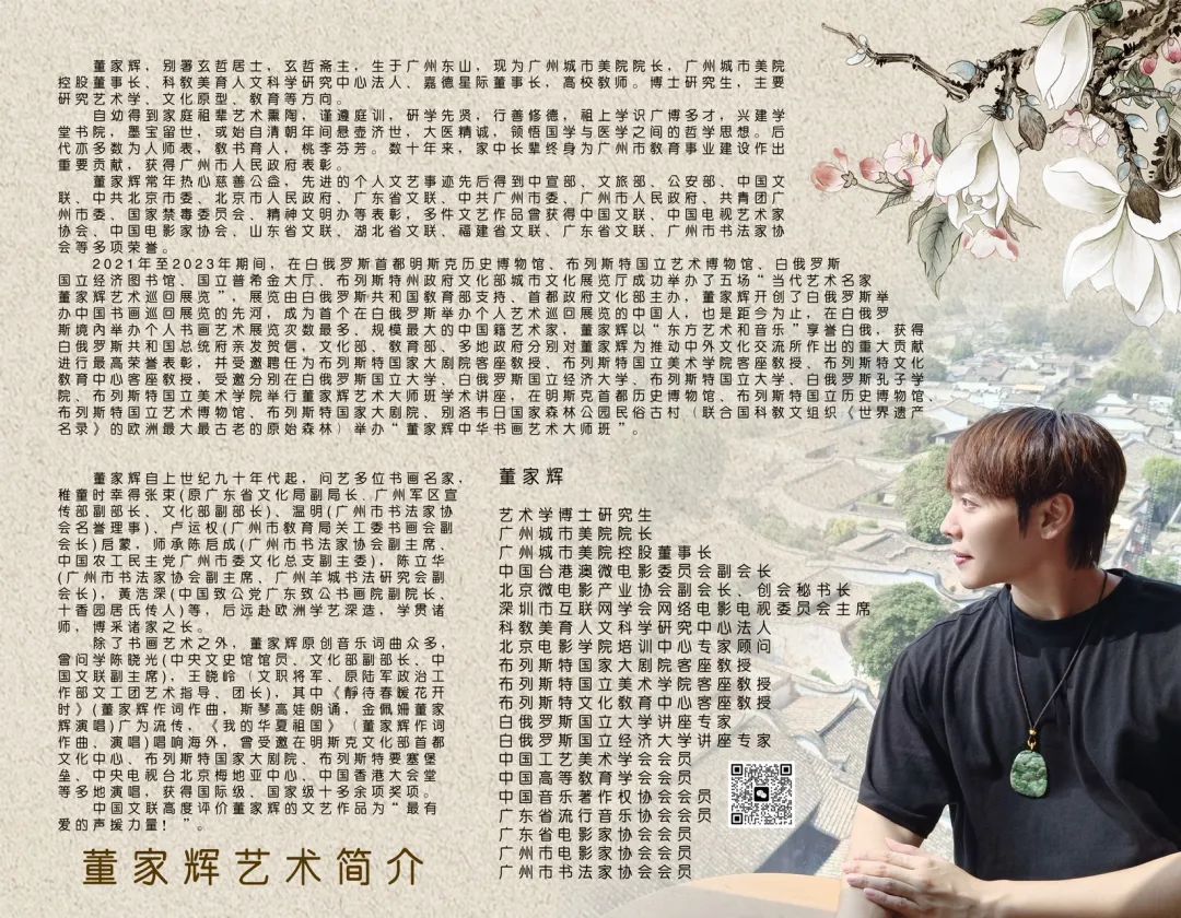 开幕仪式上,白俄罗斯共和国驻中国广州总领事馆总领事安德烈·波波夫在开幕致辞中感谢董家辉先生多年来积极推动中白文化交流,为促进中白友谊作出重要贡献。董家辉曾在欧洲举办5场董家辉书画巡回展,开创了白俄罗斯举办中国书画巡回展览的先河,成为首个在白俄罗斯举办个人艺术巡回展览的中国人,也是距今为止,在白俄罗斯境内举办个人书画艺术展览次数最多、规模最大的中国籍艺术家,董家辉以“东方艺术和音乐”享誉白俄,获得白俄罗斯共和国总统府亲发贺信,文化部、教育部、白俄罗斯多地政府分别对董家辉为推动中外文化交流所作出的重大贡献进行最高荣誉表彰。董家辉受邀聘任为布列斯特国家大剧院客座教授、布列斯特国立美术学院客座教授、布列斯特文化教育中心客座教授,分别在白俄罗斯国立大学、白俄罗斯国立经济大学、布列斯特国立大学、白俄罗斯孔子学院、布列斯特国立美术学院举行董家辉艺术大师班学术讲座,在明斯克首都历史博物馆、布列斯特国立历史博物馆、布列斯特国立艺术博物馆、布列斯特国家大剧院、别洛韦日国家森林公园民俗古村(联合国科教文组织《世界遗产名录》的欧洲最大最古老的原始森林)举办“董家辉中华书画艺术大师班”。