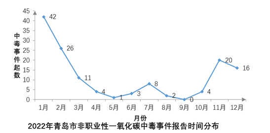 一氧化碳中毒是环境健康问题中少有的致命性中毒事件。在青岛,一氧化碳中毒事件主要发生在供暖季,高发月份为11月入冬到次年的2月份,主要因煤炭或柴取暖不当所致。