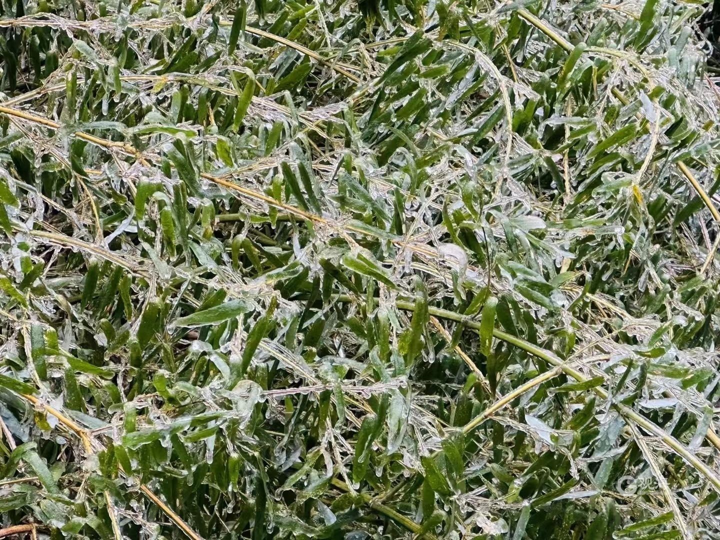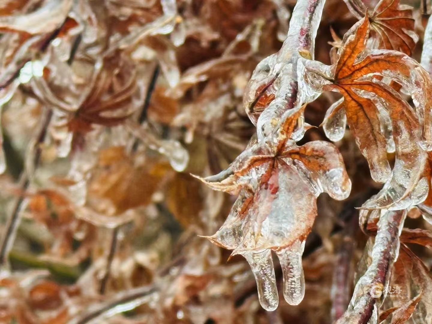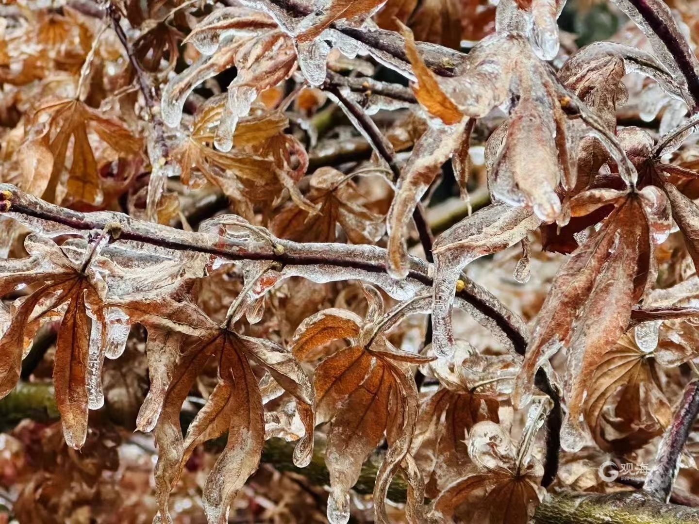 资料显示,雨凇,俗称“树挂”,也叫冰凌、树凝,是指过冷却的液态降水(冻雨)碰到地面物体后直接冻结而成的毛玻璃状或透明的坚硬冰层,其外表光滑或略有隆突。近距离观看就会发现,树叶枝条都被裹在一层透明的薄冰中,晶莹剔透,分外妖娆。