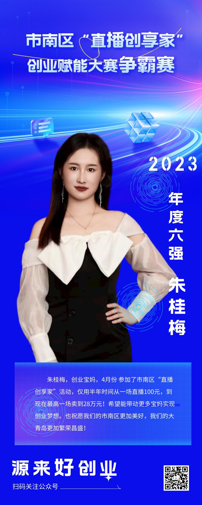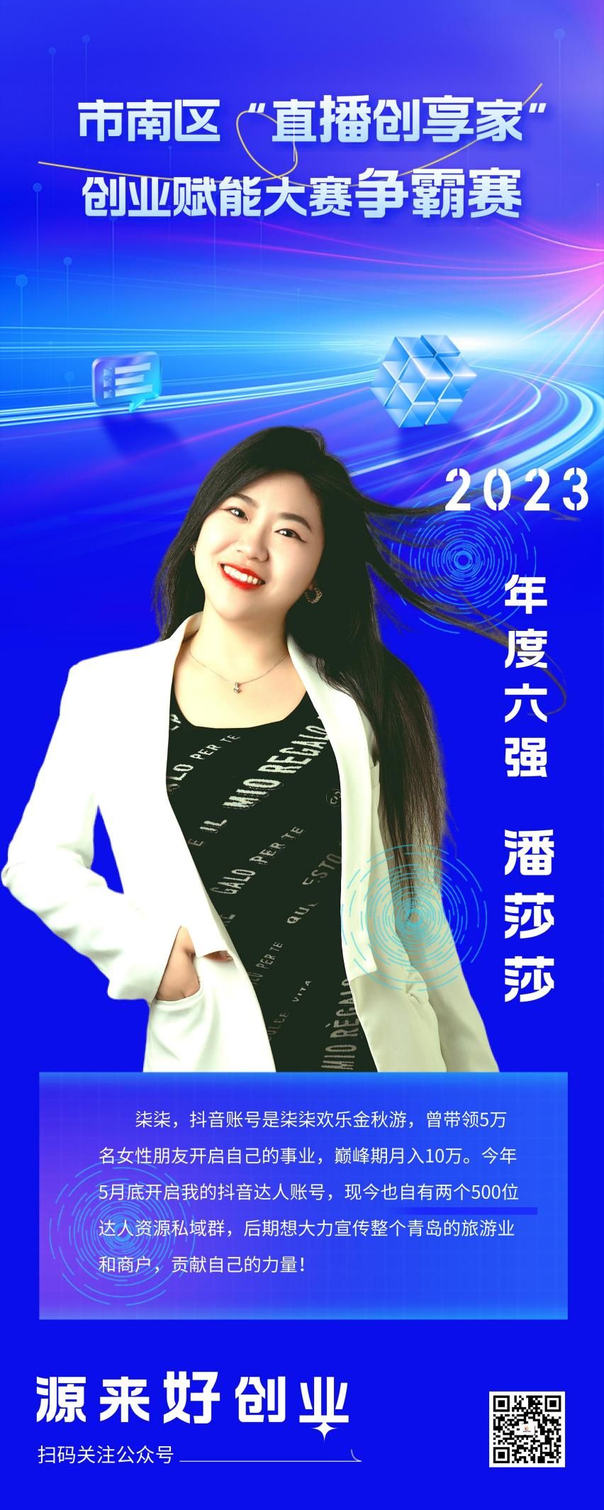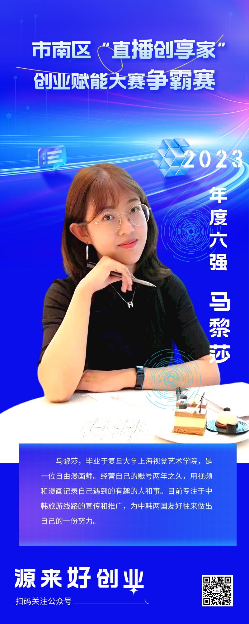 大赛自启动以来,经过前期赛事宣传、选手报名、赛前培训以及先锋赛的层层选拔,六位优秀选手进入争霸赛。近期将举行市南区“直播创享家”创业赋能大赛争霸赛暨颁奖典礼,敬请期待!