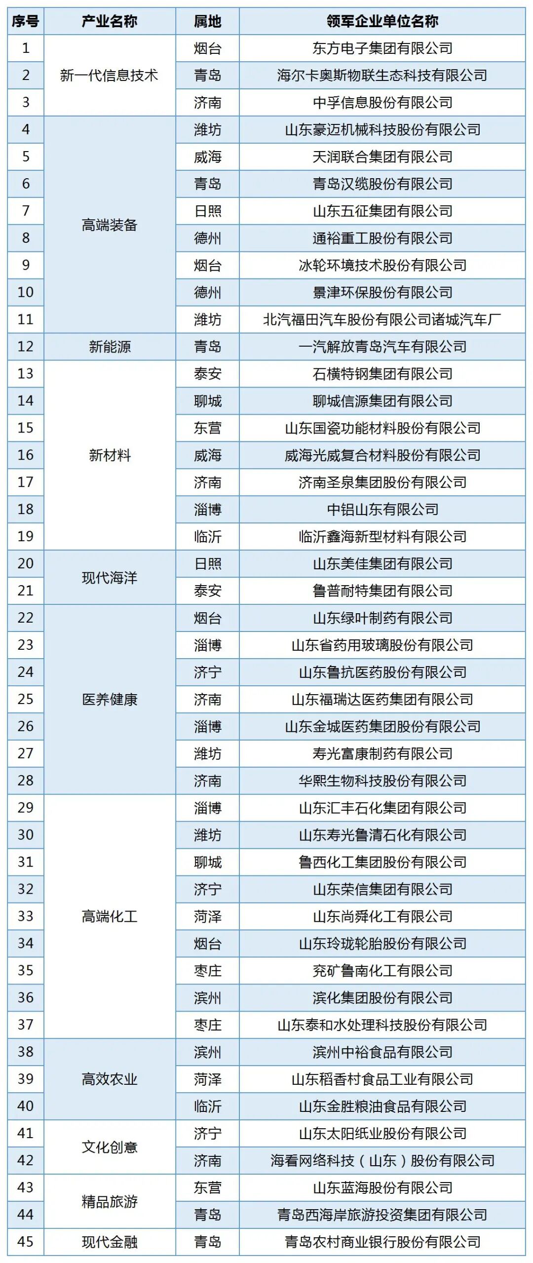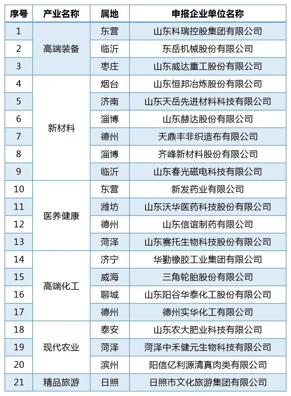 山东省“十强”产业集群领军企业库拟入库领军企业名单(第二批)