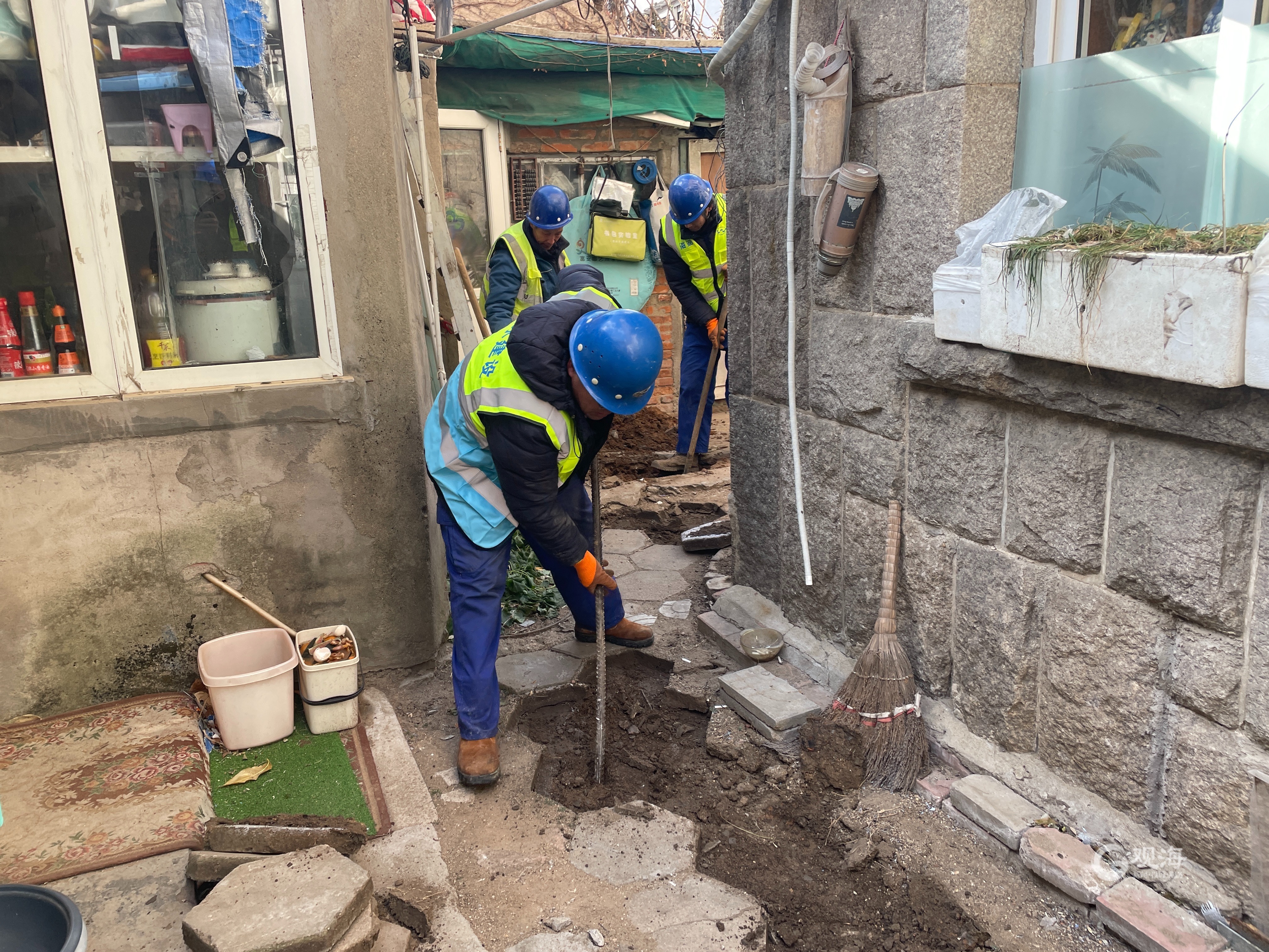 12月16日清晨,市南所接到电话得知江苏路街道华山路15号113户家中水管封冻后,党员志愿者服务队冒着风雪严寒第一时间赶赴现场,经排查发现,此处过表管道为用户自建架空管道,因周末无人居住,加之一夜寒风,内部水管被封冻。“基本上每遇寒冬都会被冻住,以往我都用温水浇灌,但这次怎么浇也不化冻,这才求助你们。”居民说。经分析研判,在这么低的温度下,如采取传统化冻方式可能无法达到解冻的效果。针对具体情况,服务队给予了废弃架空管,铺设地下管的解决方案,经过连续20多小时的方案制定、管道铺设,用户恢复供水。这一举措彻底解决了用户多年来的冬季用水困扰。