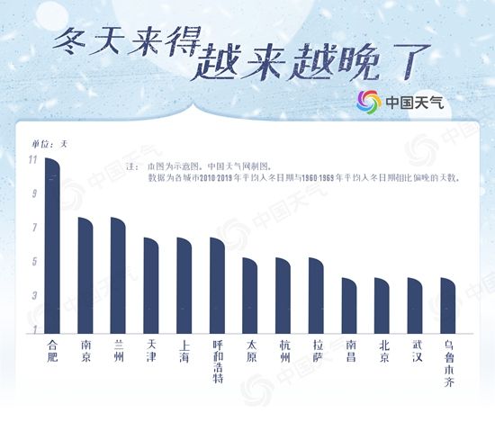 随着全球气候变暖,很多城市的冬季也开始变得爱“迟到”了。中国天气网梳理了1960年以来我国省会级城市入冬日期的年代际变化,发现21世纪10年代和20世纪60年代相比,绝大部分城市的冬天都来得更晚了,像是江南、华北等地平均入冬日期都推迟了5天及以上,合肥甚至推迟了11天。