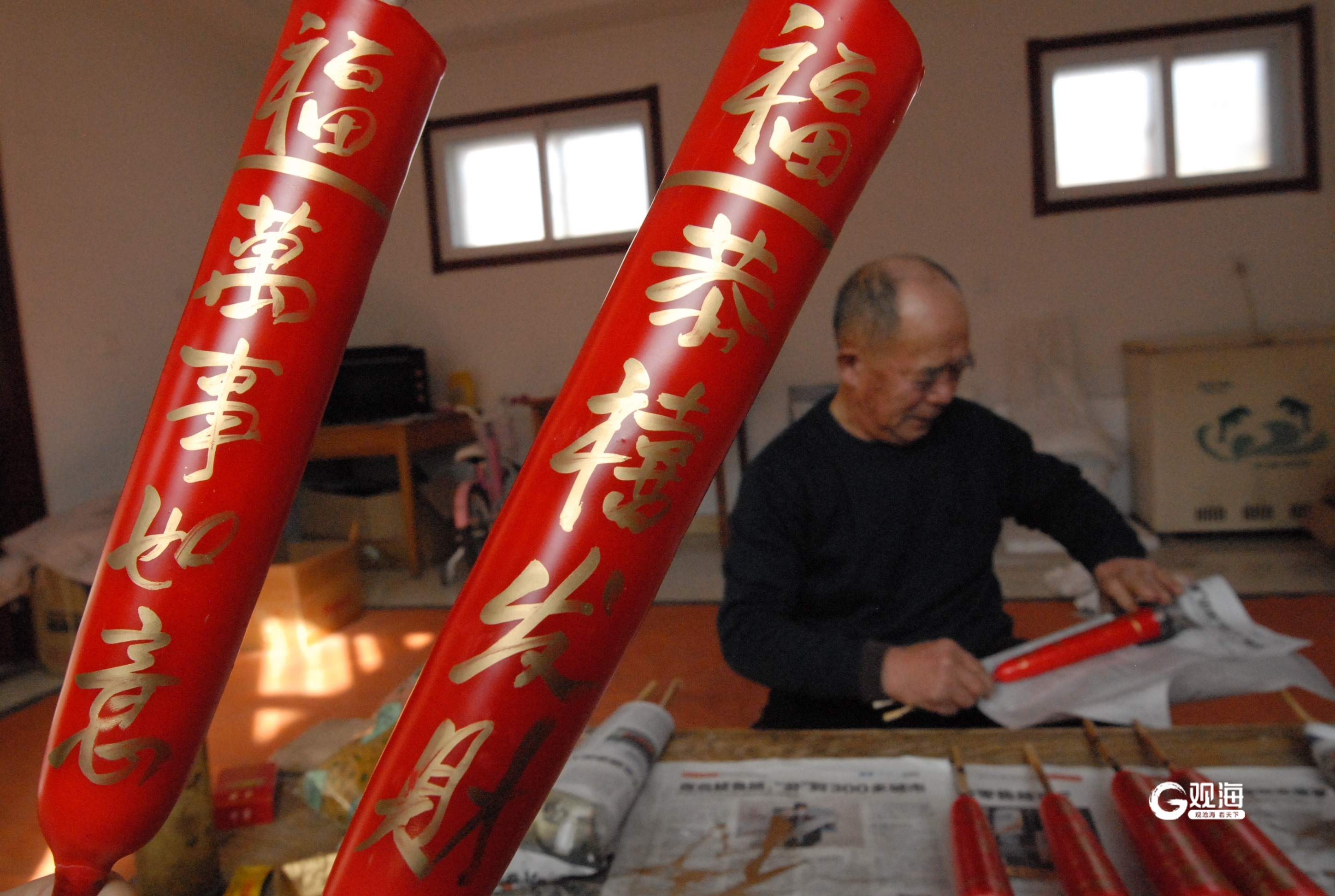 在即墨区环秀街道前南庄村,69岁的盛瑞建正在家中赶制蜡烛。墙上挂着一排排做好的大红蜡烛,箱子里还有一对对写好了烫金字、用报纸包装好的红蜡,准备赶集的日子拿到集上售卖。
