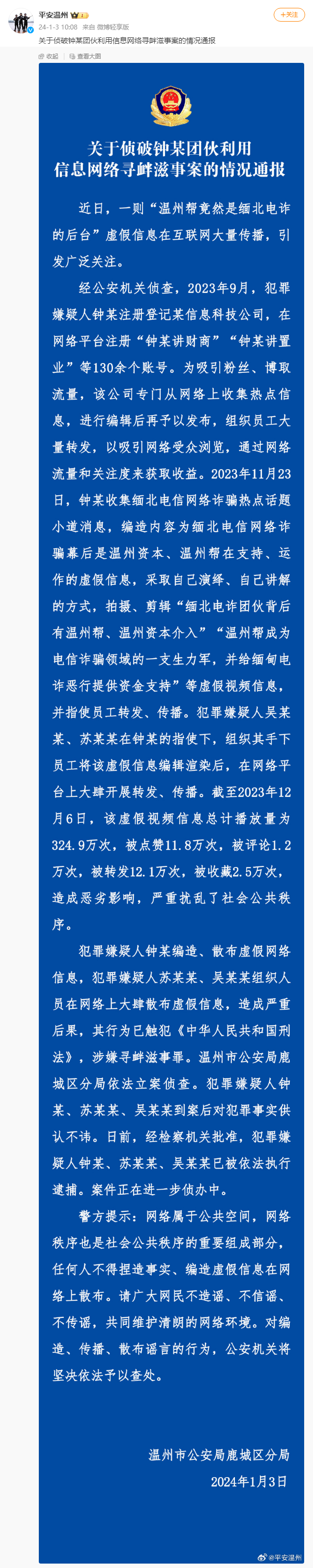 2023年11月23日,钟某收集缅北电信网络诈骗热点话题小道消息,编造内容为“缅北电信网络诈骗幕后是温州资本、温州帮在支持、运作”的虚假信息。