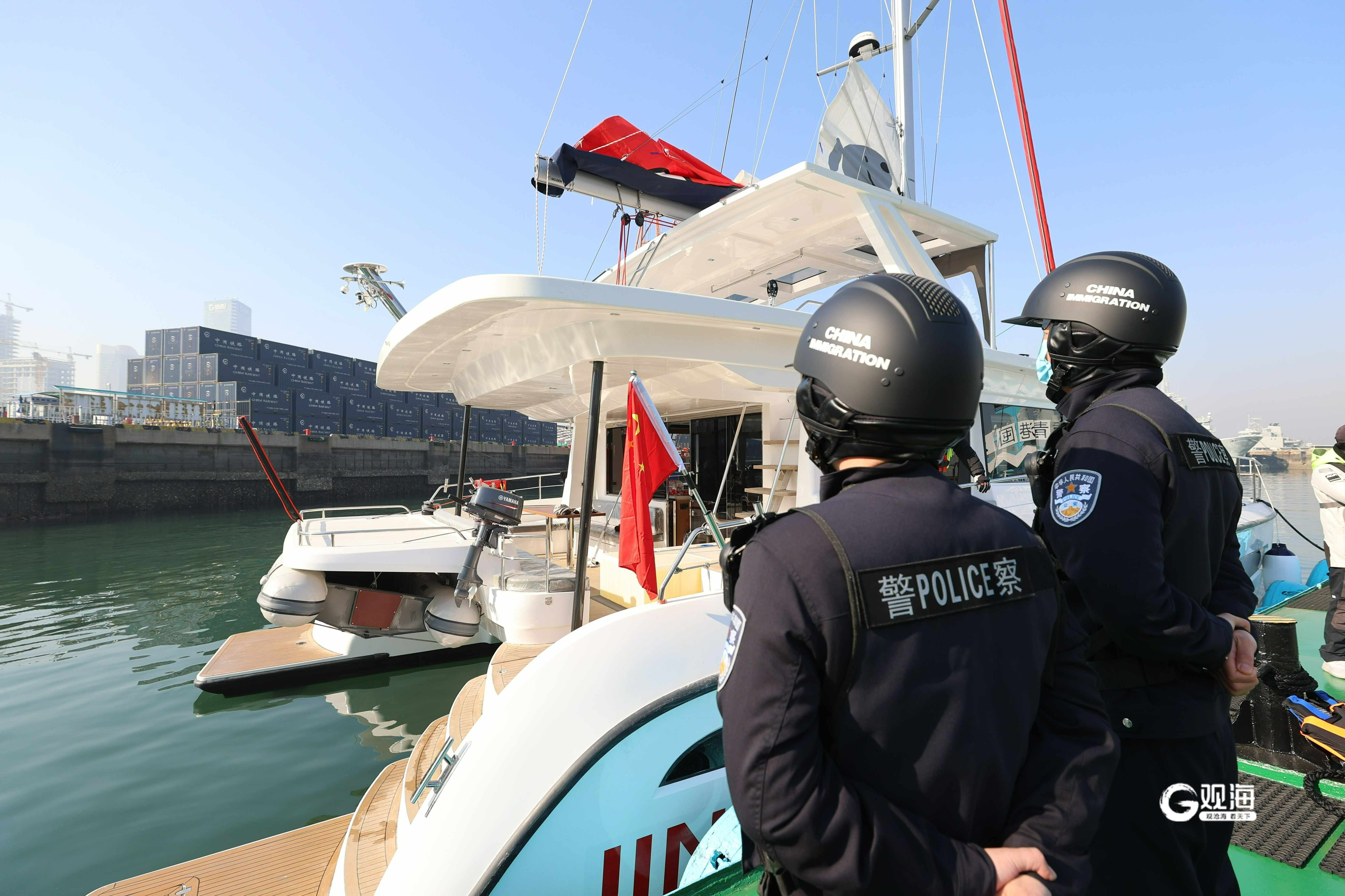 “‘海洋之书’双体帆船是山东口岸首艘私人新造双体帆船,船舶类型特殊,在接到船情通报后,我们积极与船主和代理沟通,第一时间掌握船舶动态,精心制定专项勤务方案,高效完成船体检查及人员出境验放任务,实现边检通关‘零等待’。”综合执勤一队队长王培锋介绍说。
