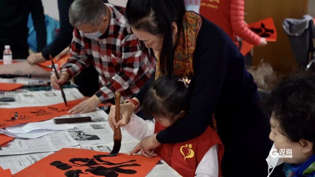 现场还有几位老年人聚精会神,挥笔如飞,他们是金门路街道大尧社区红源青墨书画社的成员,听闻这次活动就赶了过来。“我要给这个活动点个赞!”大尧社区红源青墨书画社社长张树森表示,“过年了,家家户户欢欢喜喜,我们不能忘记需要关爱的空巢老人。通过活动,我们既能传递温暖,也能和书法协会的书法家们互动交流,共享书法的乐趣,传承传统文化。”在现场,他们还热情地教授起小学生们如何书写“福”字。