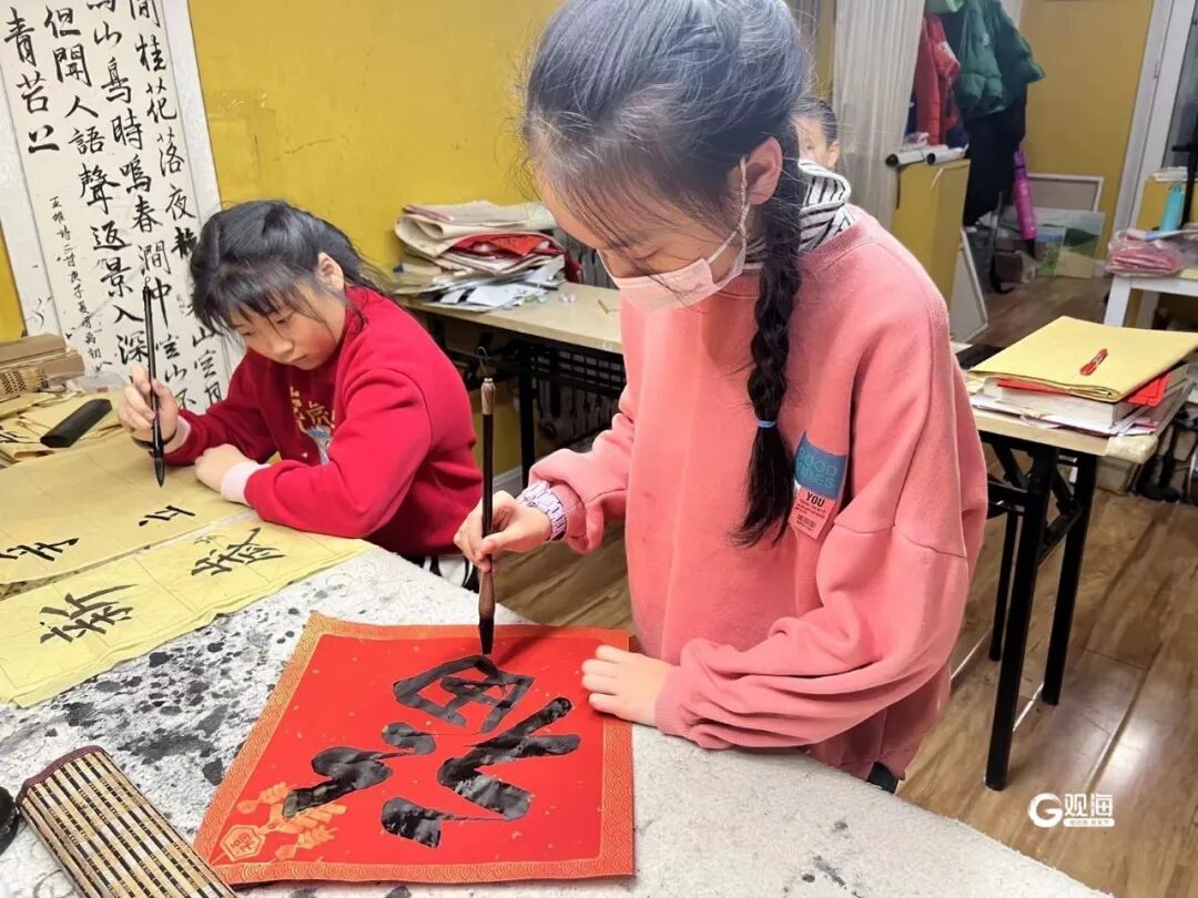 北仲路第一小学李若霖等书法学员在铭家书画工作室为老人写新年福字。