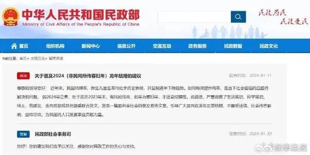 近日,有网友在民政部官网上留言,建议民政部或其他部委联合发文,引导居民不受迷信影响龙年正常结婚。民政部社会事务司对此回应表示将予以关注。