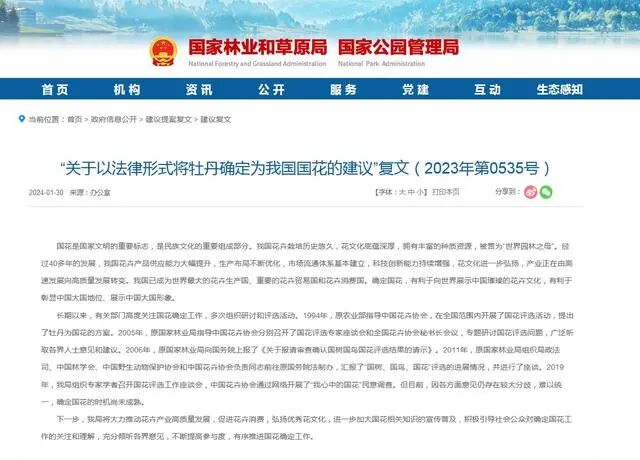 国家林草局官方网站近日发布了“关于将牡丹依法定为我国国花的建议”复文,表示目前因各方面意见仍存在较大分歧,难以统一,确定国花的时机尚未成熟。