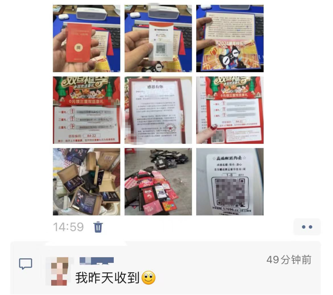 快递内有一张卡片,注明扫描卡片上的二维码即可领取平台派发的红包或礼品。