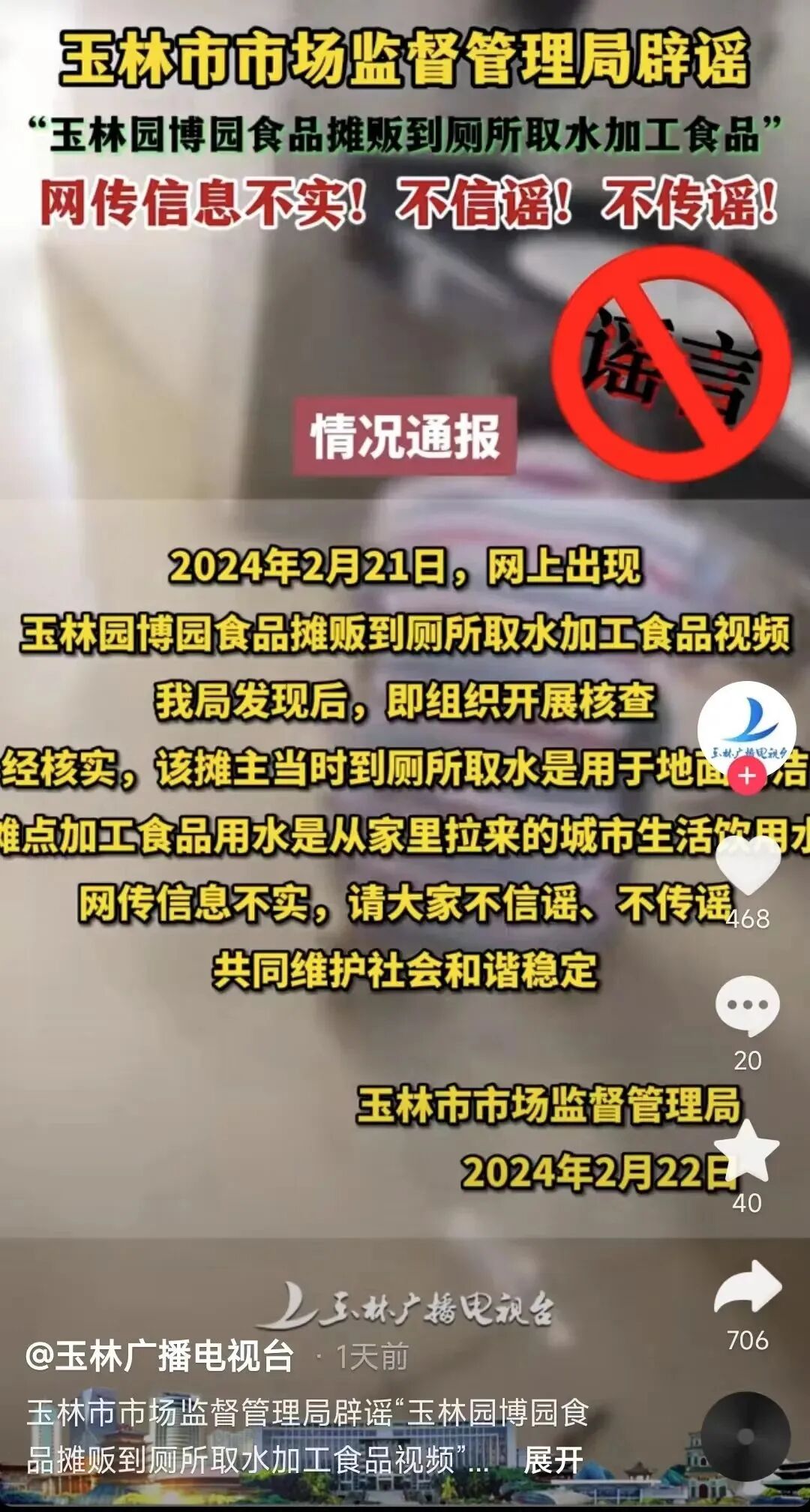2月22日,玉林市市场监督管理局发布情况通报表示,经核实,视频中摊主到厕所取水是用于地面清洁,加工食品用水是从家里拉来的城市生活饮用水,网传信息不实。