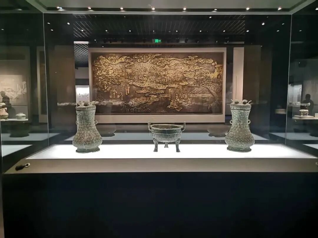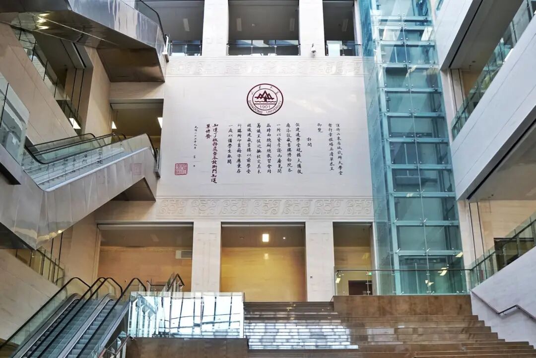 走进博物馆,中庭感觉就像小两号的山东省博物馆,但山大元素很醒目。方鼎造型的背景墙延续了“鼎承古今”的设计理念,以山大校徽作为主体标识,下方镌以清光绪年间山东省试办大学堂章程,并使用青铜器纹样作为辅助装饰。