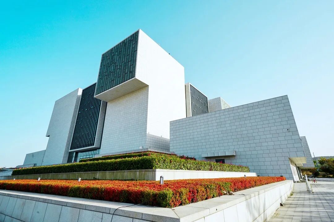 博物馆形体由“鼎”字变换而来,取“鼎承古今”之意,旨在体现它厚重的文化内涵。从远处望去,白色的墙体、独特的外形、深蓝色玻璃幕窗格外吸引眼球。大面积白色石材与“红瓦绿树”基础风格形成强烈对比,凸显其高雅的气质。