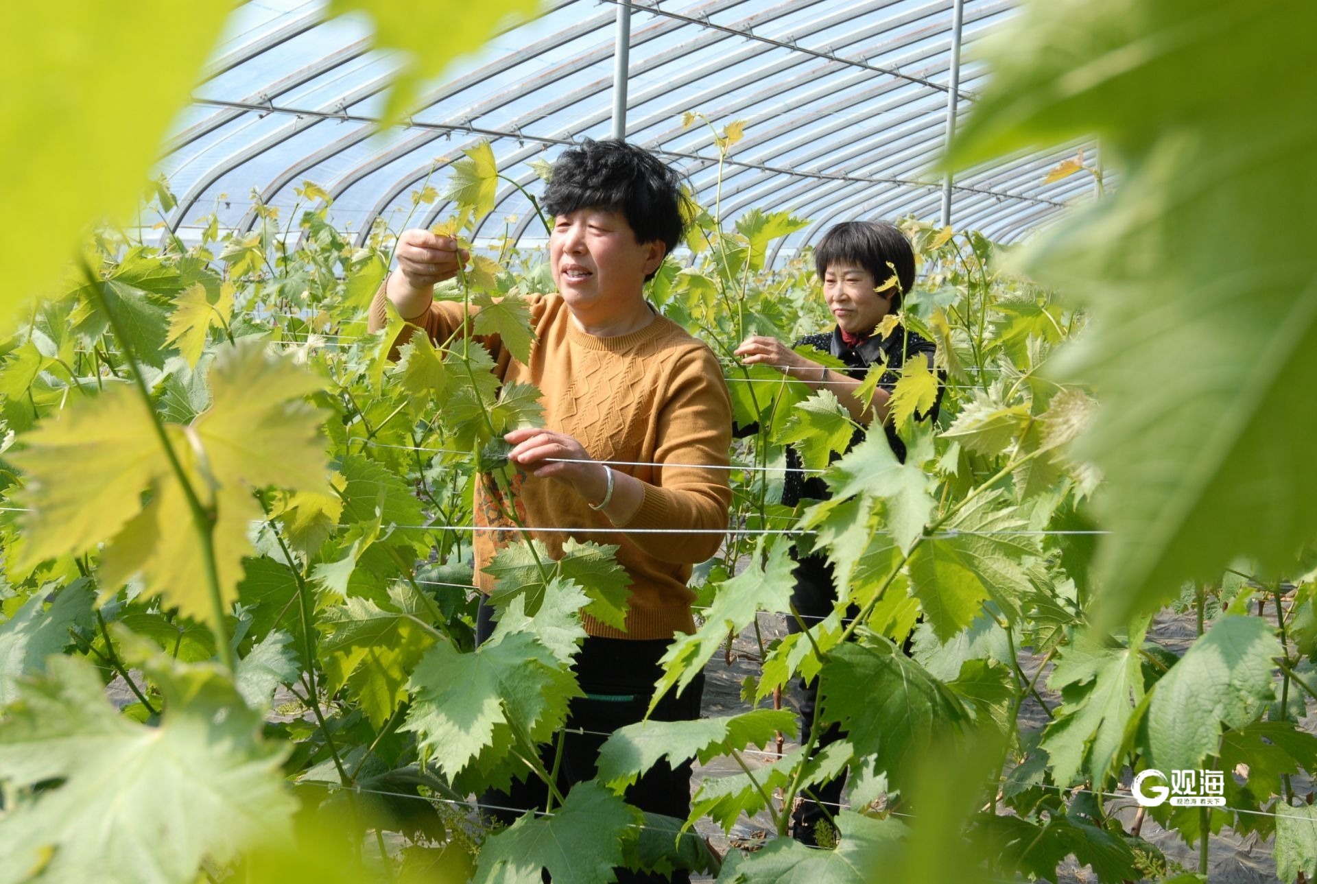在大坝村贸润蔬菜瓜果专业合作社的葡萄大棚内,工人吴芳、辛秀芹正在修剪整理葡萄枝条。据了解,棚内种植的藤稔葡萄上市早,亩产量超6000斤。“每年五月上旬葡萄上市,只要在客户微信群里一发,客商们就纷纷主动上门,单价能卖到25元一斤。”辛秀芹说。