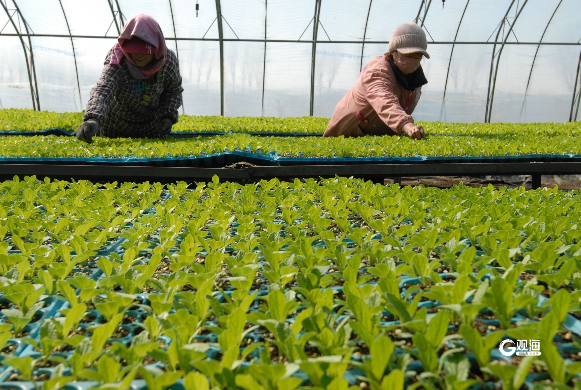 在官庄村的旺禾农业合作社育苗大棚内,一片片破土而出的种芽、一畦畦郁郁葱葱的小白菜、一垄垄的清翠欲滴的蔬菜嫩苗,生机勃勃、长势喜人。基地负责人王方帅正在大棚内查看菜苗长势。“一共育了8个大棚,主要育白菜、西红柿、黄瓜、辣椒、茄子、西瓜苗等,全年育苗数量保守估计1000万株,销往湖北、浙江及省内莱州、平度、莱西等地方,其中仅旱黄瓜这一项,种苗年产量就有300万株。”王方帅说。