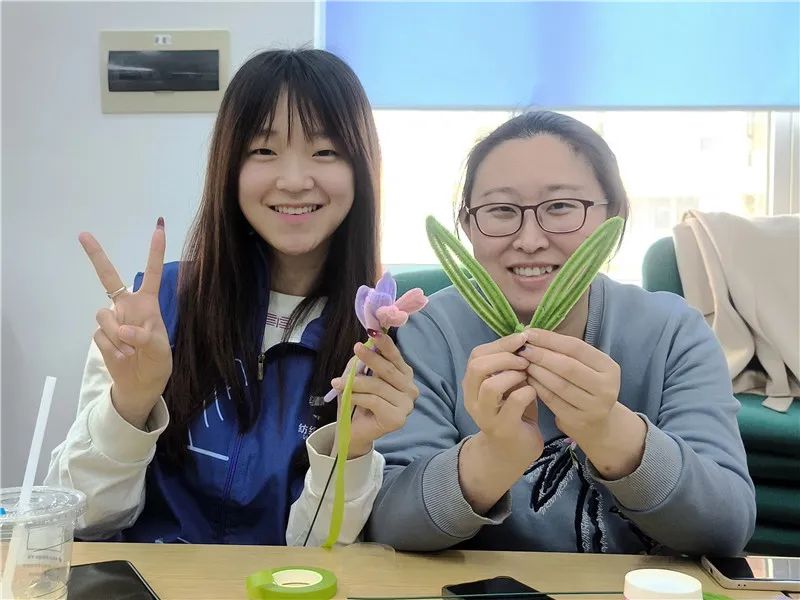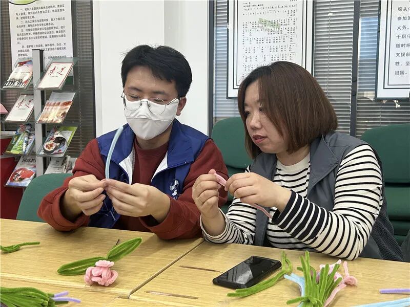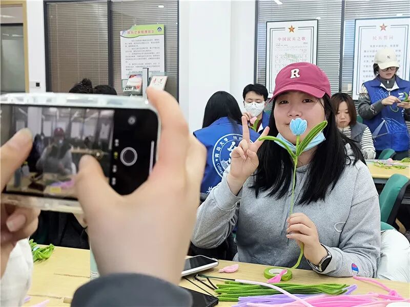 专业赋能过后,成员们进入了欢乐的扭扭棒世界,本次减压环节社工链接青岛大学纺织服装学院参与其中,由其陪伴成员们利用扭扭棒进行郁金香花束的制作。在轻松愉快的氛围下,成员们的创意被充分激发,他们在常规的步骤下举一反三,充分发挥自己的想象力,经过一番拧、折、穿、缠等步骤,一朵朵色彩斑斓、极具特色的郁金香花束呈现在我们眼前。“来来来,你拿着你的成品,我用刚刚讲的技巧给你拍一张。”成员们手拿作品,以练代战,纷纷实践起来。“今天不仅学习了摄影的一些技巧,还学会了自己制作郁金香,今天收获真是不少。”一位参与的社区工作者向社工分享到。
