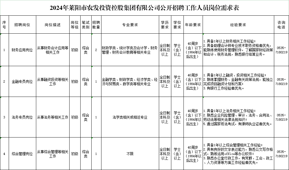 公开招聘工作人员的岗位条件、招聘人数等具体要求见《2024年莱阳市农发投资控股集团有限公司公开招聘工作人员岗位需求表》。