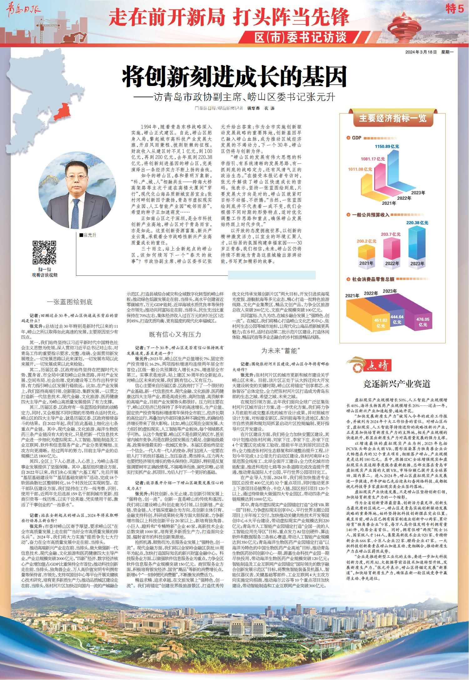 ——崂山区推动高端新兴产业走在前、当排头。做大做强新一代信息技术、现代金融、文化旅游和医药健康四大主导产业,产业总规模突破2000亿元;支持双国创中心等平台开展关键核心技术研究,培育更多新质生产力;张村河片区加快迈向国内一流的产城融合示范区。