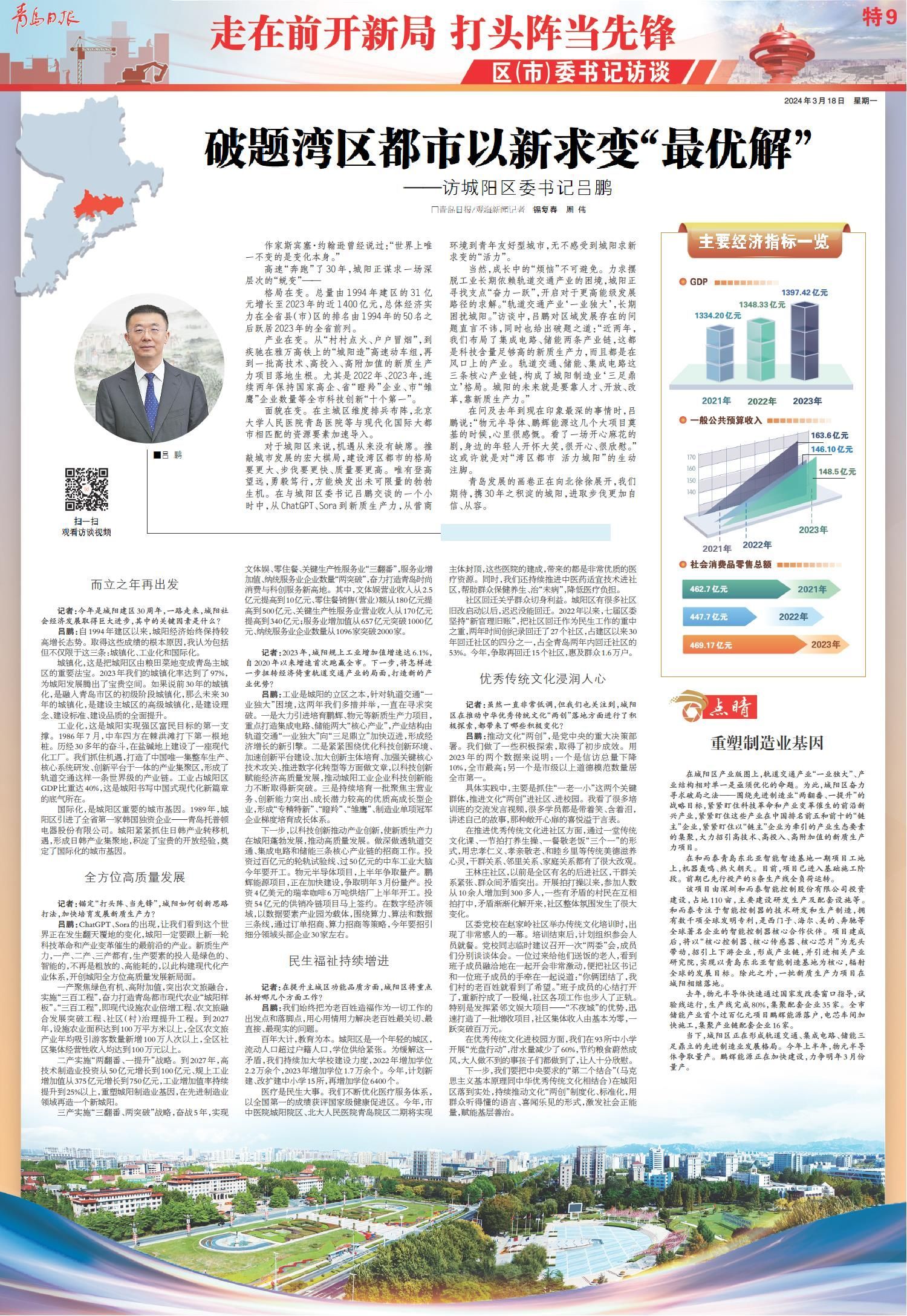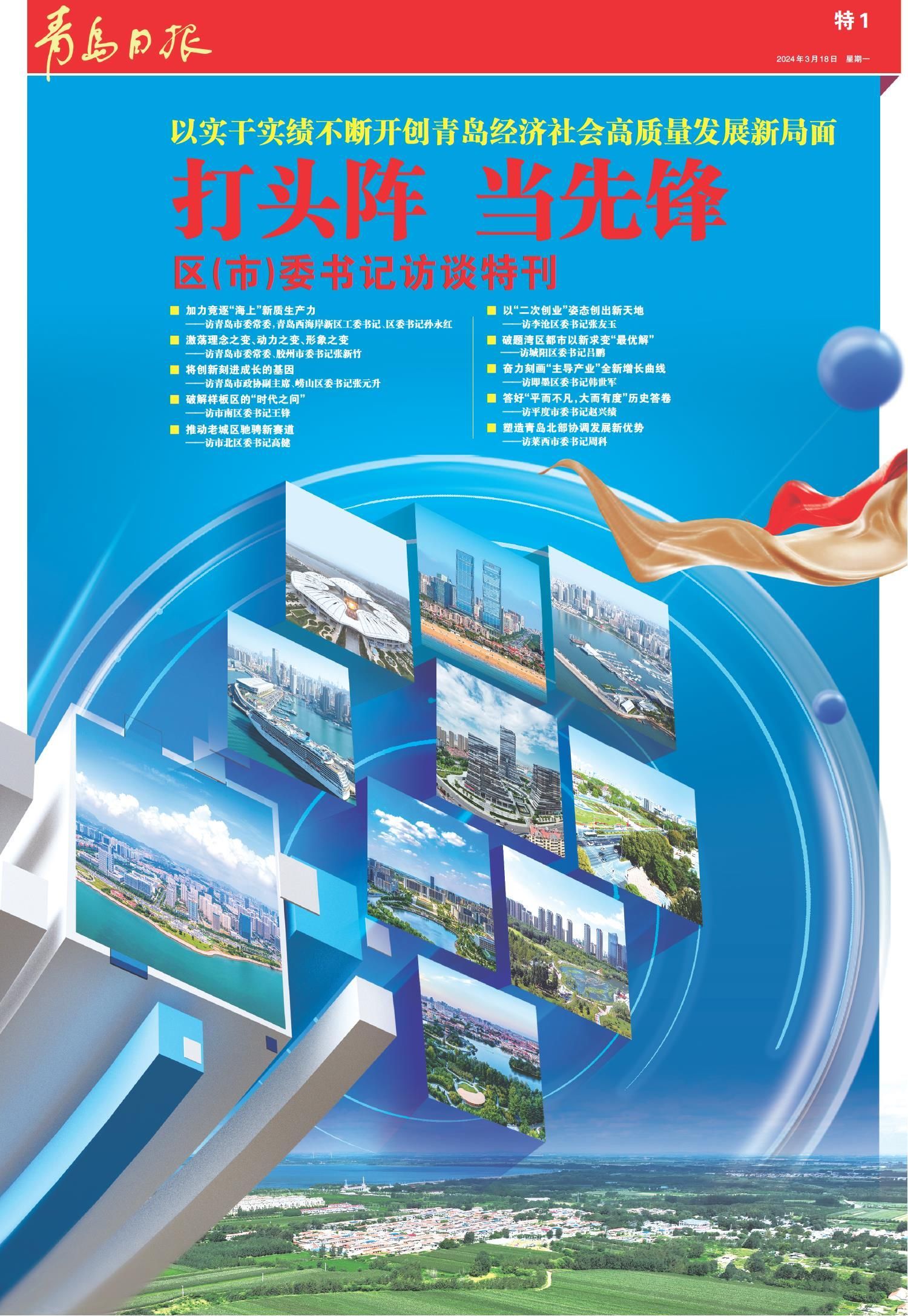 地域上,青岛是十个区市的总和;发展上,十个区市是青岛的承托——区市强,则青岛强。当前,战略机遇和困难挑战交错叠加,各区市如何创新路径打法“打头阵、当先锋”,怎样加快发展新质生产力,直接关系到青岛高质量发展的成色。青岛日报今日集中推出《打头阵 当先锋——区(市)委书记访谈特刊》,展现各区市的新思考、新谋划、新举措。