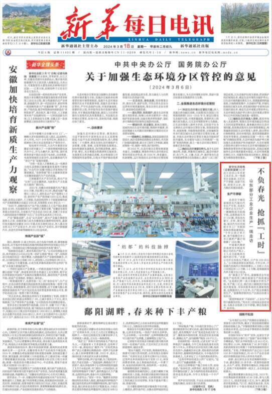 齐鲁网·闪电新闻3月18日讯 今天出版的《新华每日电讯》在头版刊发新华社记者在山东部分工业企业生产一线走访调研文章《不负春光 抢抓“工时”》,点赞山东企业生产不停歇、创新不松劲、转型不止步,努力跑出发展加速度。