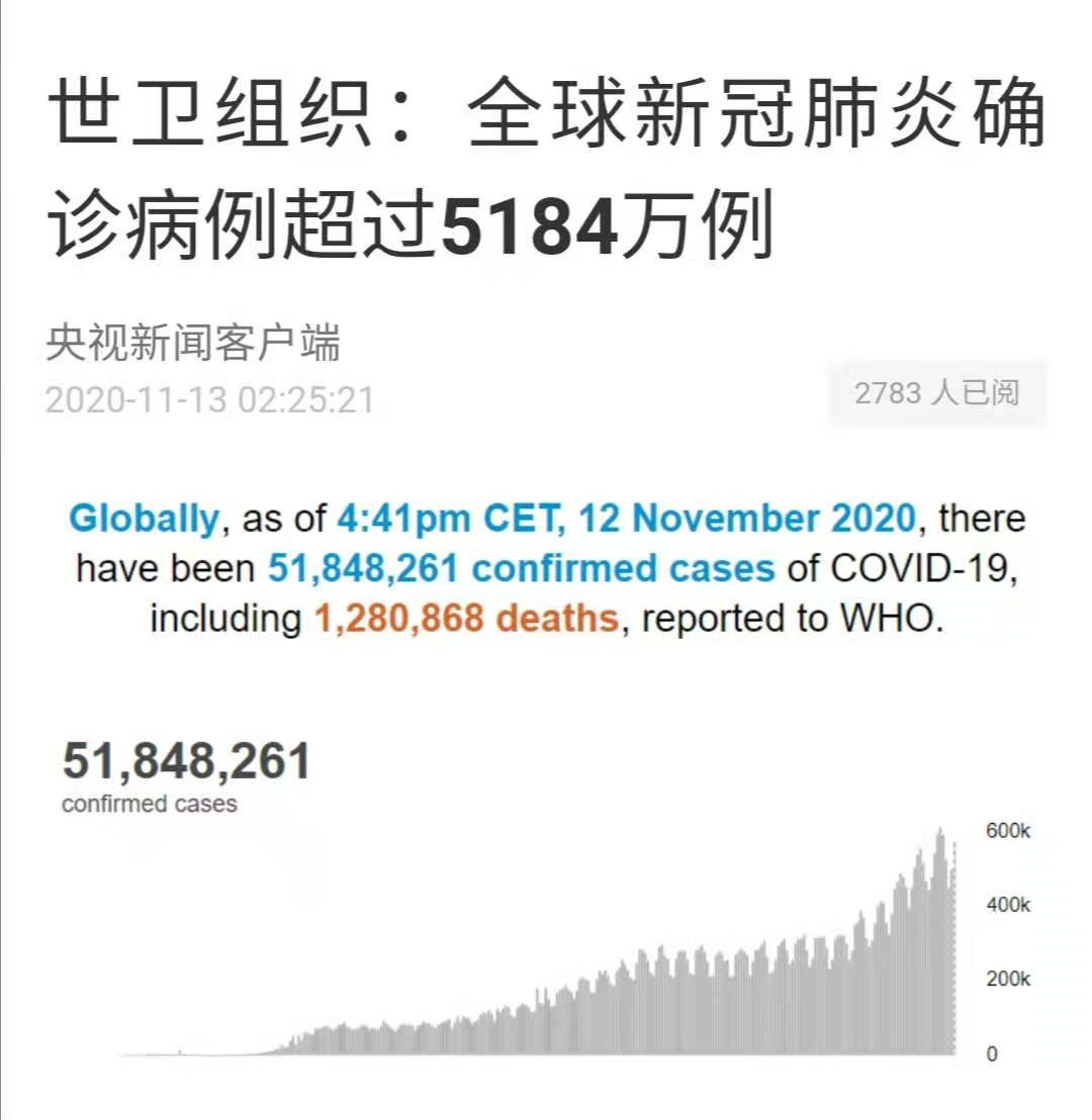 根据世卫组织最新实时统计数据,截至北京时间11月12日23时41分,全球累计新冠肺炎确诊病例51848261例,累计死亡病例1280868例。