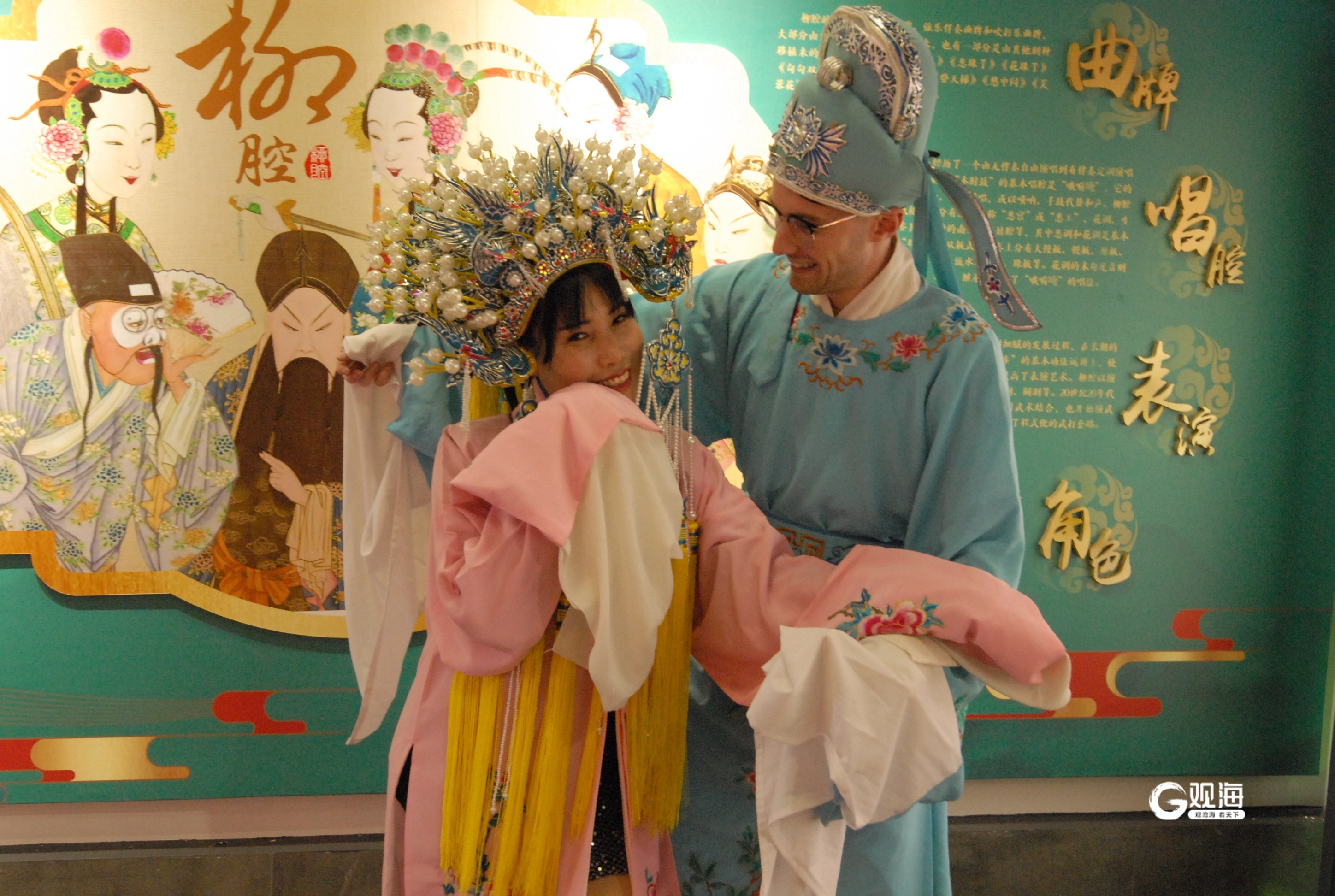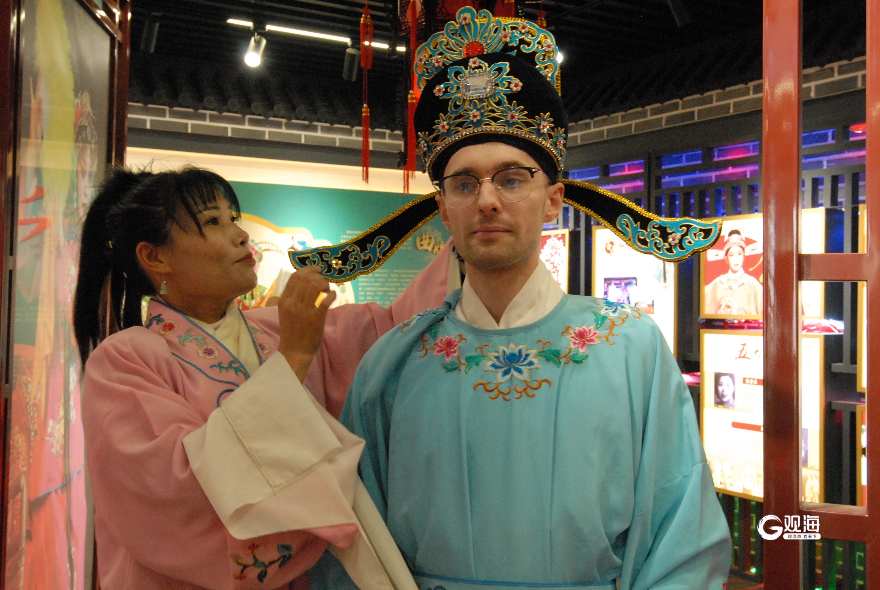 在柳腔博物馆,讲解员给外国友人介绍了柳腔的起源与发展。在柳腔老师的带领下,Julian Millidge穿戏服、带行头,打扮成小生扮相,沉浸式学习柳腔表演的形体动作和经典唱段。“贤妹,你来看呐。”水袖一甩,眼神一定,他一板一眼的学唱引来在场观众的阵阵掌声。 (青岛日报/观海新闻记者 王涛 通讯员 张涛 于思玮 文/图)