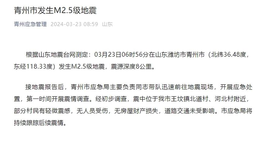 接地震报告后,青州市应急局主要负责同志带队迅速前往地震现场,开展应急处置,第一时间开展震情调查。经初步调查,震中位于我市王坟镇北道村、河北村附近,部分村民有轻微震感,无人员受伤,无房屋财产损失,道路交通未受影响。市应急局将持续跟踪后续震情。
