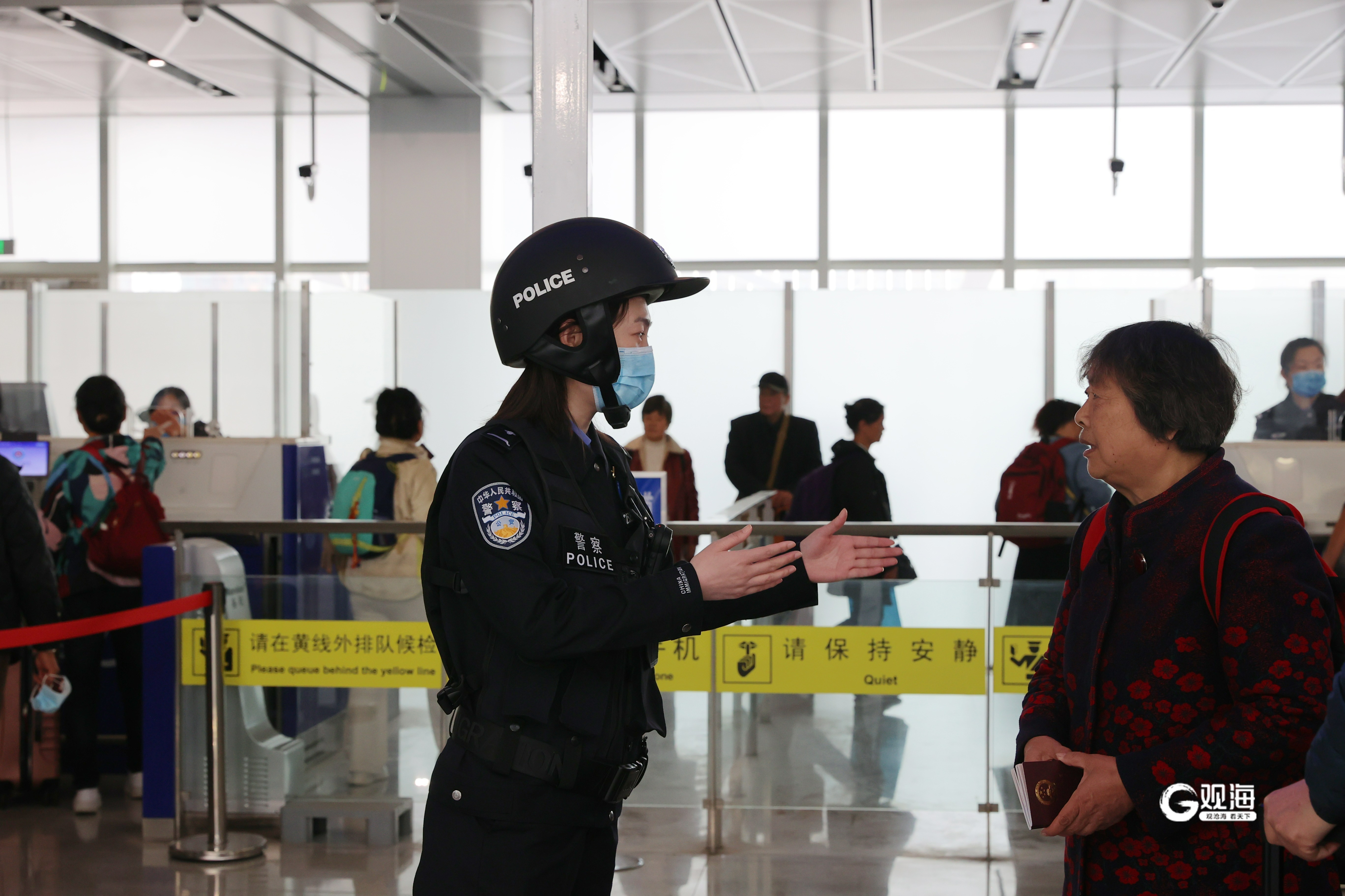 青岛出入境边防检查站民警正在为旅客答疑解惑。