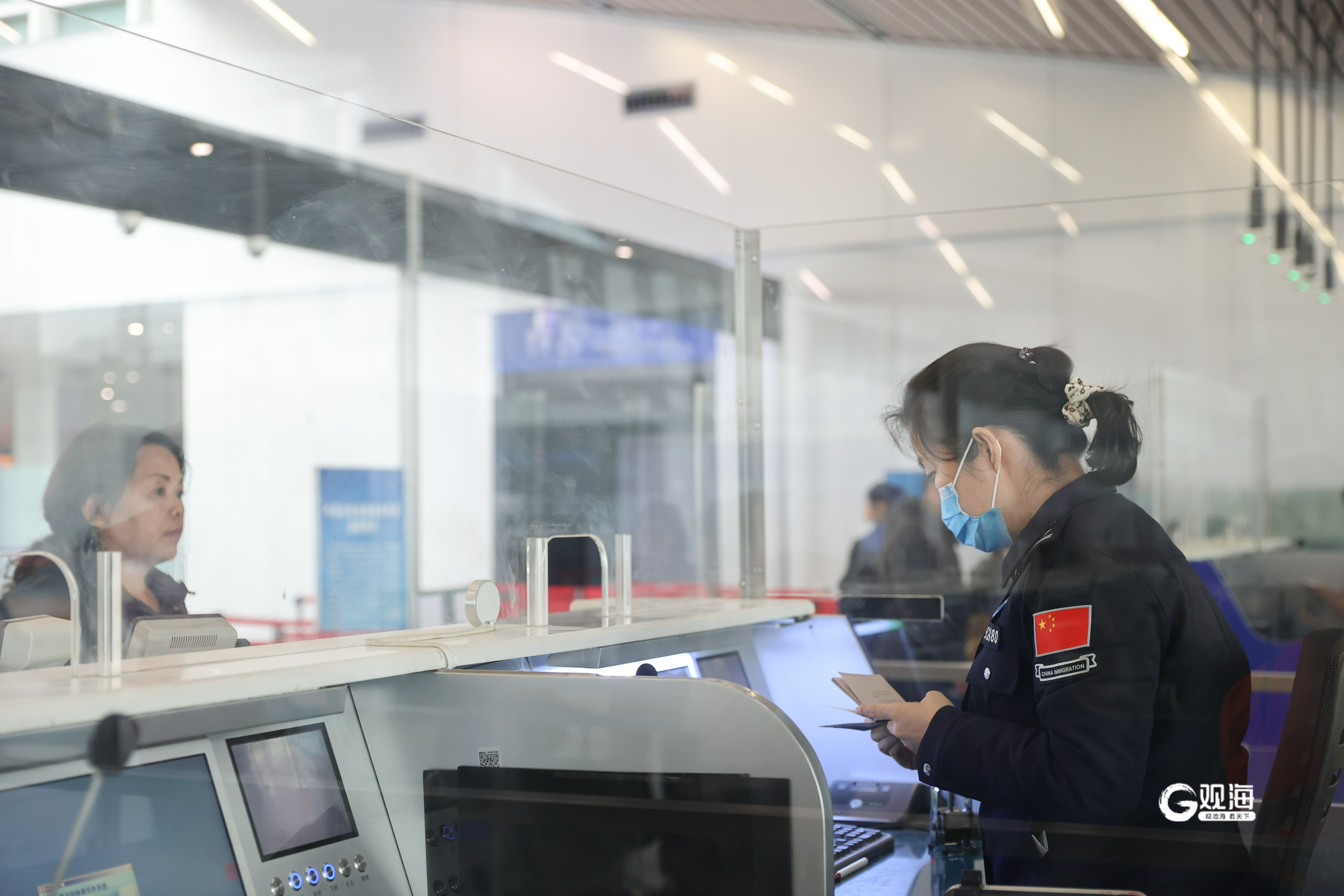 青岛出入境边防检查站民警正在为旅客办理边检手续。