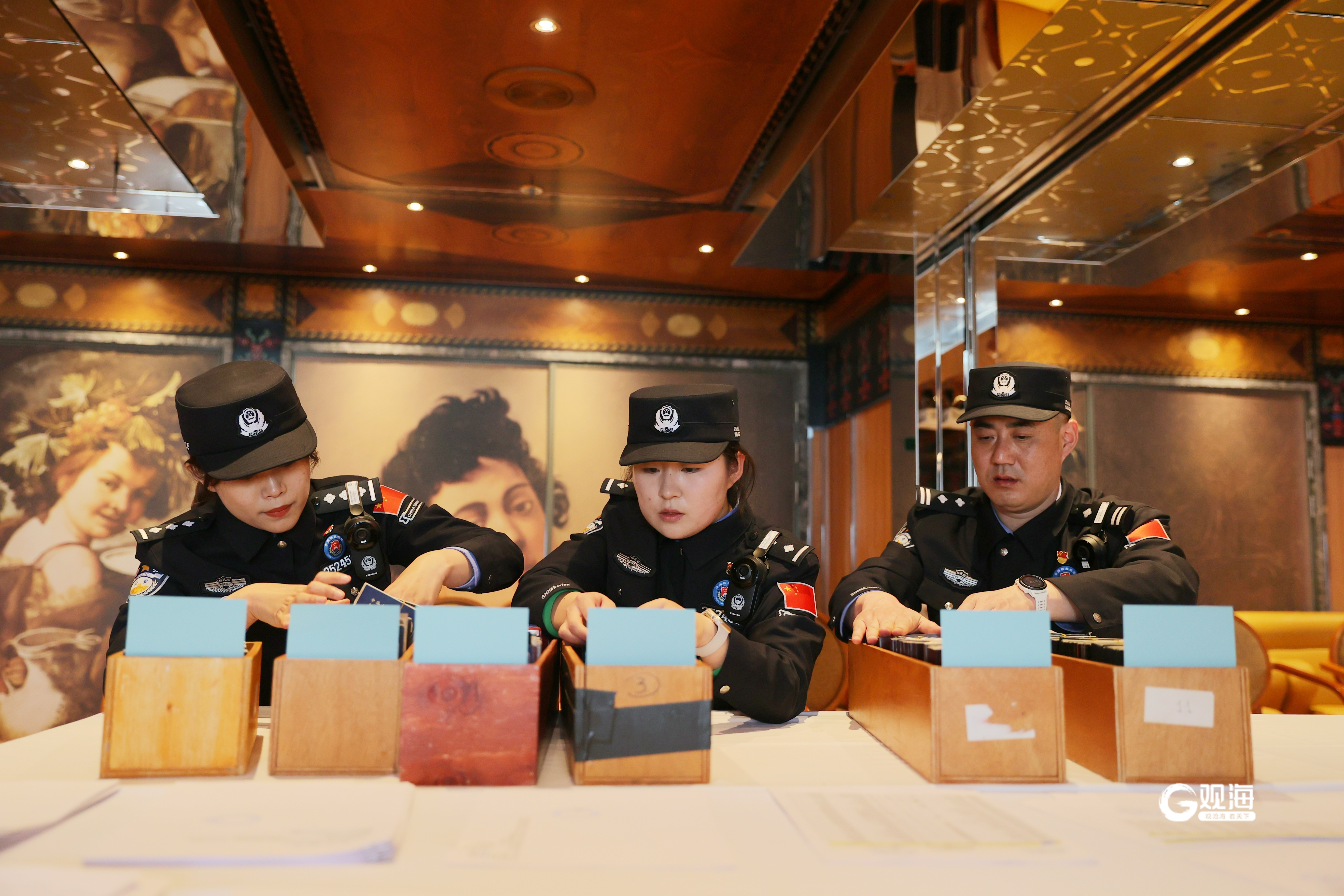 青岛出入境边防检查站民警清点证件。
