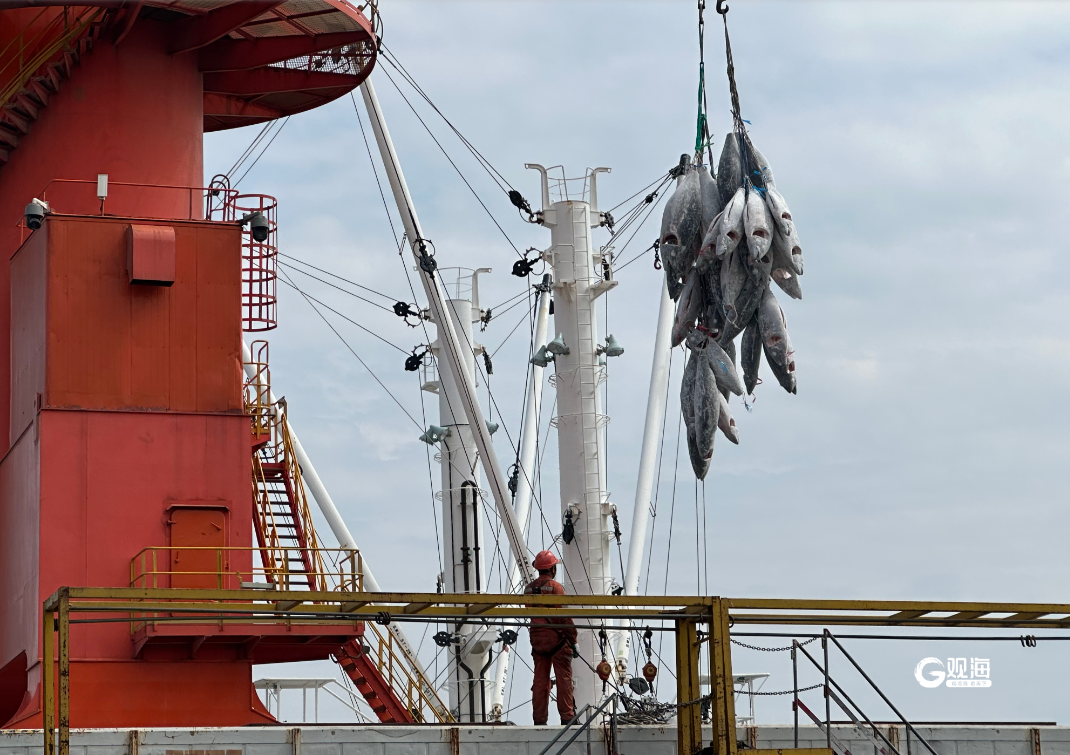 “海洋之星”轮是中国首艘金枪鱼超低温冷藏加工运输船,加工季单日加工量可达66吨,各项加工指标均处行业一线水平,此批金枪鱼主要为黄鳍金枪鱼、大目金枪鱼,每条重约50—100斤,从南非开普敦运往韩国釜山,将在中国卸载1976吨。