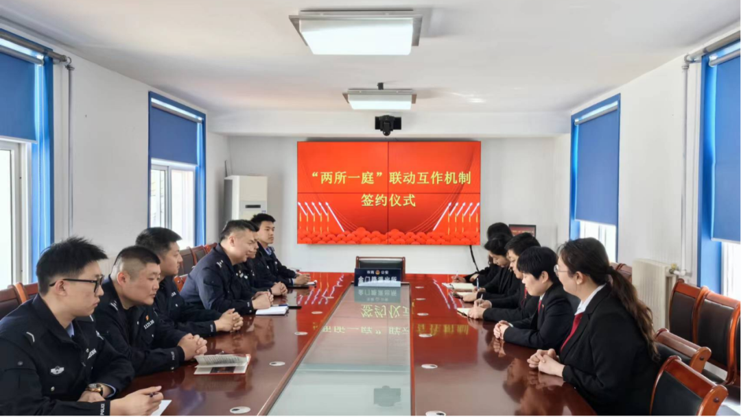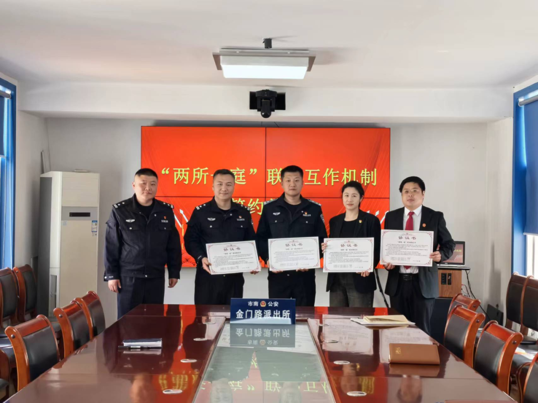 在签约活动中,金门路派出所所长邱磊磊、金门路司法所所长丁青霞和金门路法庭庭长赵方栋,就“两所一庭”共同在矛盾纠纷化解、普法宣传、优化营商环境等方面中实现资源共享、凝聚共识、挖掘合力,形成“法治金门”社区治理共同体达成共识,现场签署《“两所一庭”联动协议书》,并邀请中国刑事警察学院杨文博教授作为见证人。