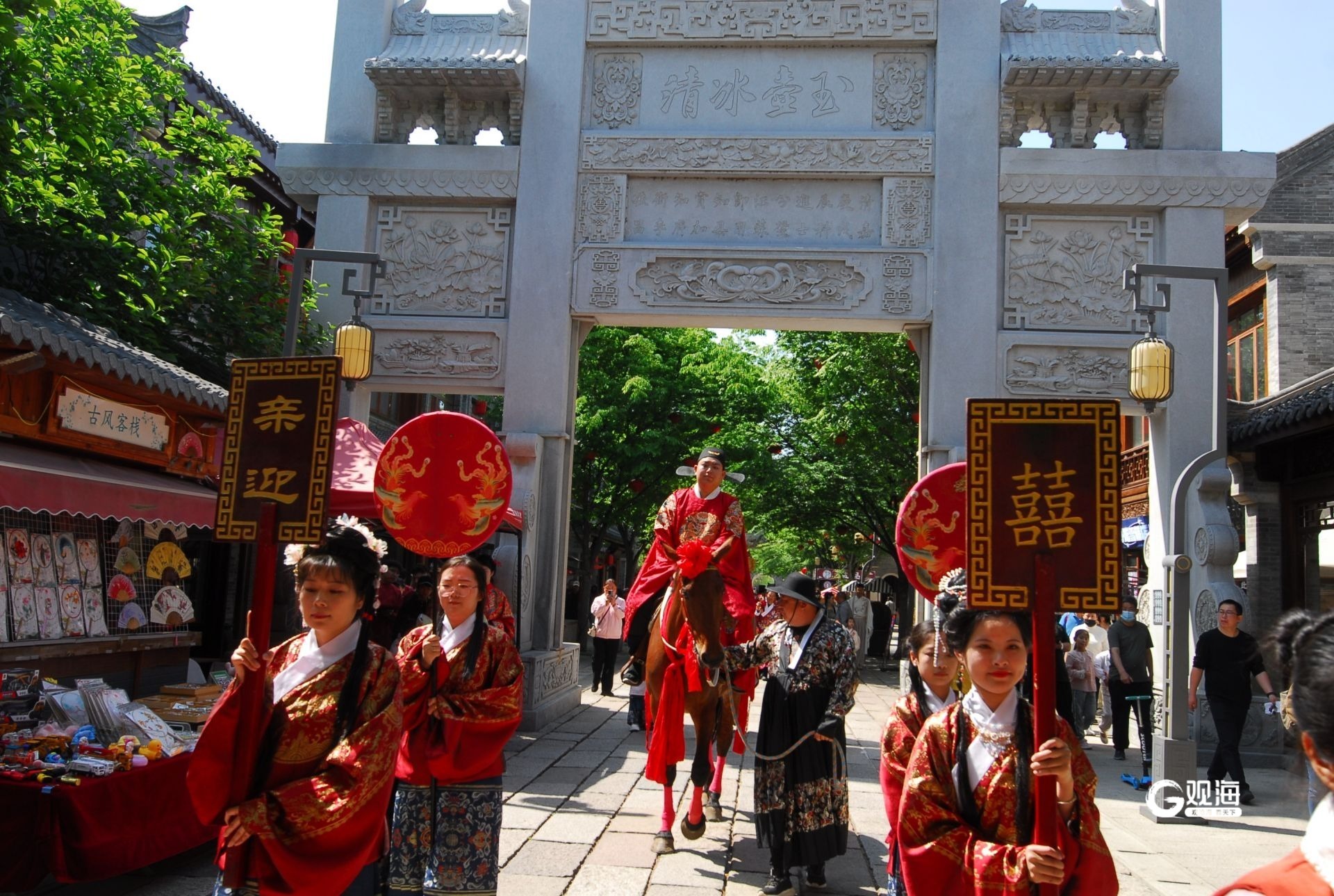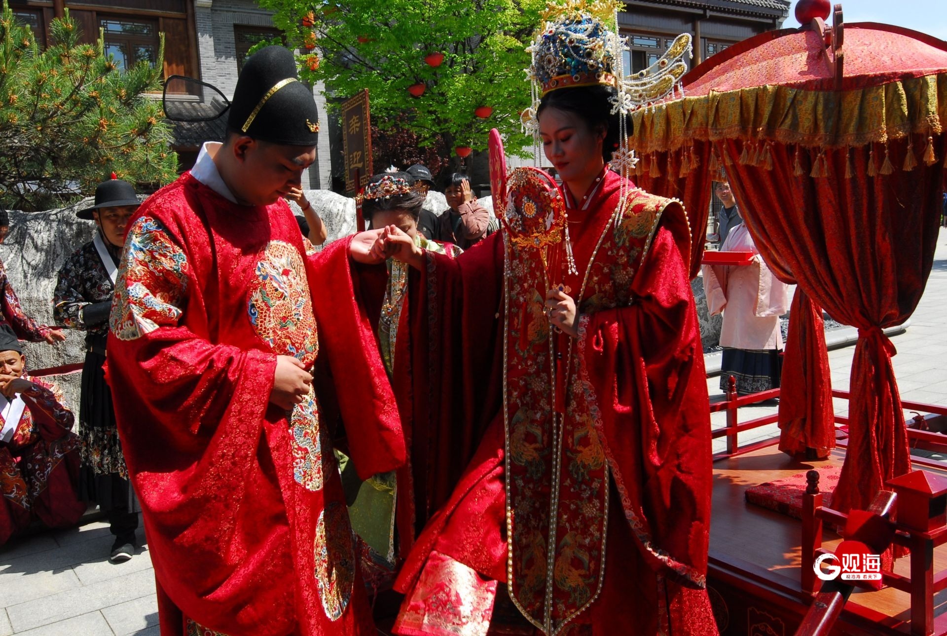 青岛日报社/观海新闻4月27日讯 蓝天白云下的即墨古城,6对新人喜结连理,现场嘉宾、亲朋及游客共同见证他们爱的誓言。4月27日上午,在欢快喜庆的音乐声中,一场简约而不简单、传统且富于时尚的中式集体婚礼浪漫开场。