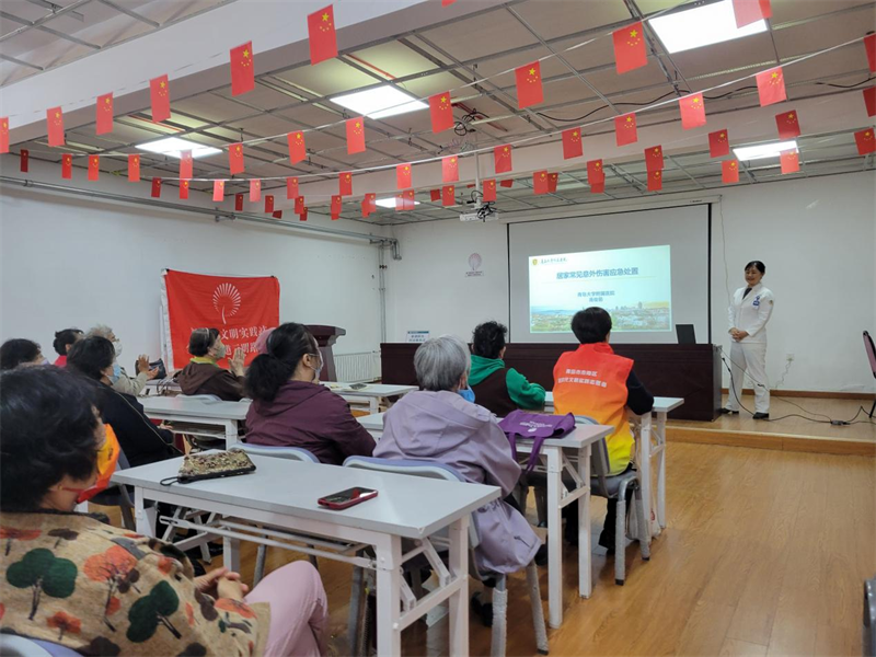 此次讲座邀请了青岛大学附属医院市南院区门诊总护士长高俊茹、消化内镜中心护士长宋文讲解居家常见意外伤害防范与护理和消化内镜知识。首先高护士长围绕老年人常见的鼻出血急救、烧烫伤急救、心前区疼痛、异物梗阻、癫痫与溺水、中暑与晒伤、鱼刺卡喉、脑卒中等方面的急救知识进行详细讲解。接着宋护士长详细地解释了内镜技术在医学科学中作用地位、消化内镜发展简史和消化道早期癌症内镜诊断技术。