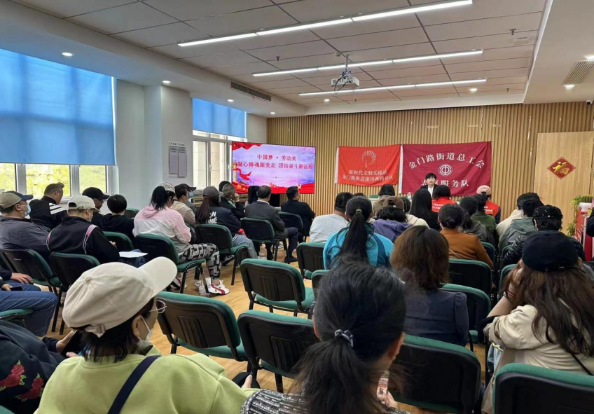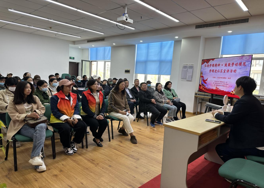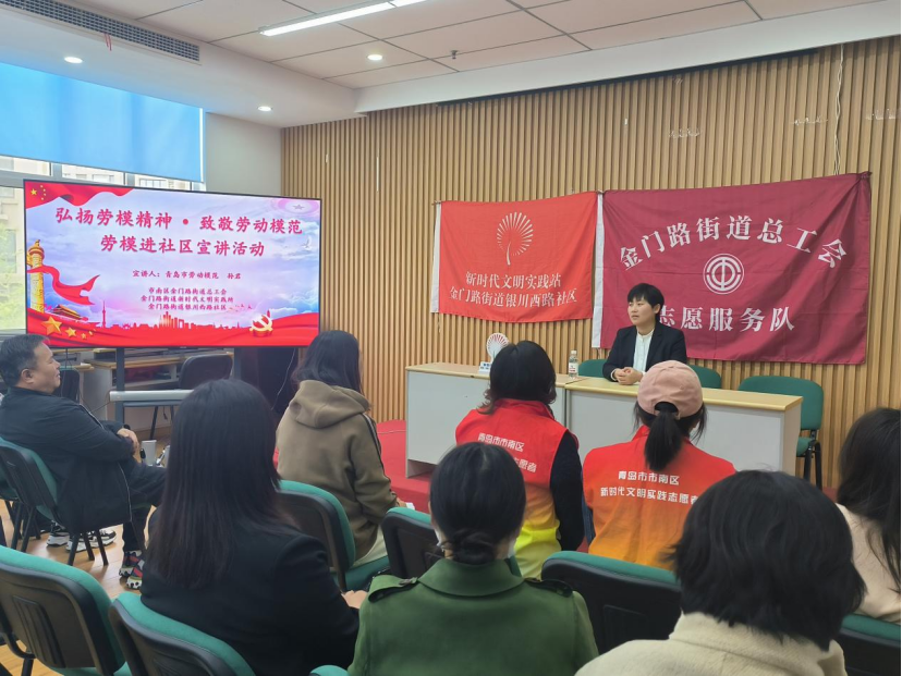 青岛日报社/观海新闻4月30日讯 为进一步讲好劳动故事弘扬劳模精神,倡树劳动光荣的社会风尚和爱岗敬业的工匠精神,营造热爱劳动、劳动光荣的良好氛围,4月30日上午午,金门路街道总工会、金门路街道新实践文明实践所和银川西路社区联合开展“传承劳模精神凝聚榜样力量”劳模进社区宣讲活动。辖区青年党员、青年职工、青年教师和社区工作人员、公益岗参加活动。