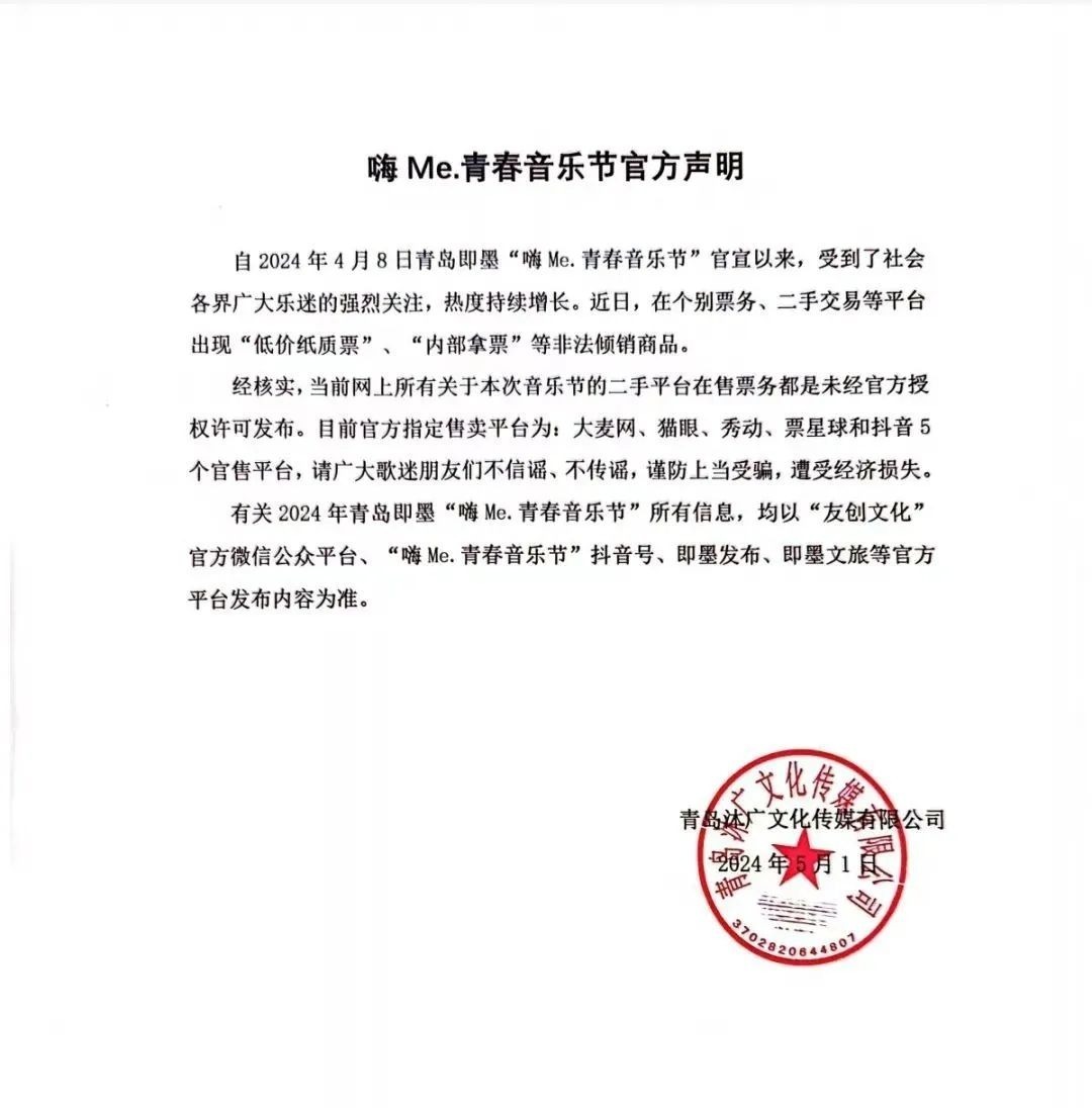 青岛日报社/观海新闻5月1日讯 自2024年4月8日青岛即墨"嗨 Me .青春音乐节"官宜以来,受到了社会各界广大乐迷的强烈关注,热度持续增长。近日,在个别票务、二手交易等平台出现"低价纸质票"、"内部拿票"等非法倾销商品。为此,音乐节官方发布声明,内容如下:(附图)