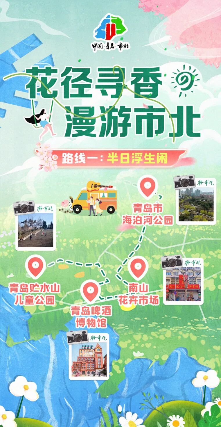 从青岛贮水山儿童公园启程,让孩童欢笑声成为春日序曲;踏入青岛啤酒博物馆,于醇厚酒香中品味时间的沉淀,仿佛连空气都带着微醺的春意;转角南山花卉市场,花海中每一片花瓣都似在诉说着春天的秘密;停于青岛市海泊河公园的水畔,心灵随着缓缓流淌的河水,沉醉于春日的宁静与美好。