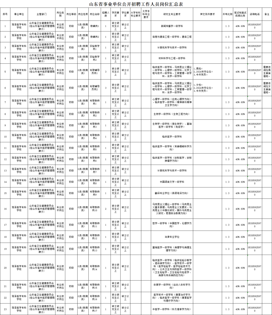 招聘岗位的各类通知均通过菏泽医学专科学校网站及报名专网发布,不再进行电话通知,请考生自行关注查询,因个人原因未及时查看通知消息而影响考试,后果自负。