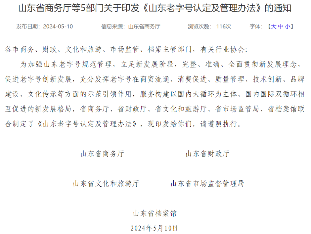 第八条 山东省商务厅会同相关部门原则上每3年认定并公布新一批次山东老字号名录。